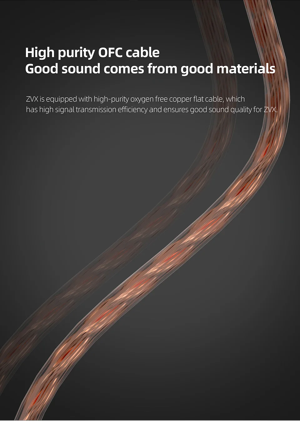 ZVX está equipado con un cable plano de cobre libre de oxígeno de alta pureza, que tiene una alta eficiencia de transmisión de señal y garantiza una buena calidad de sonido para ZVX.