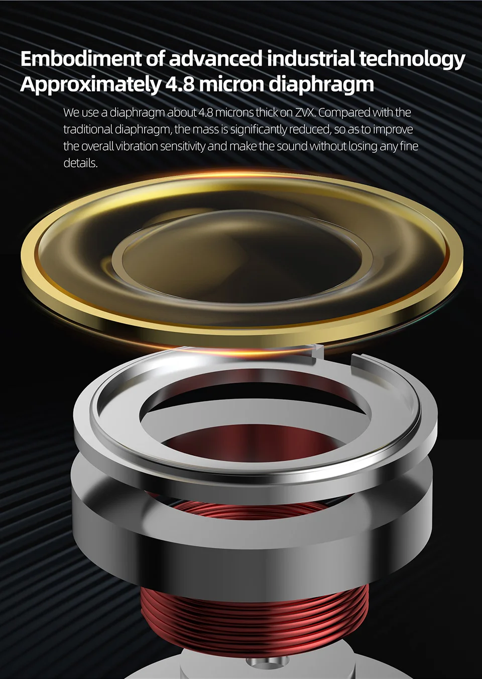 Utilizamos un diafragma de aproximadamente 4,8 micras de espesor en ZVX. En comparación con el diafragma tradicional, la masa se reduce significativamente, a fin de mejorar la sensibilidad general a la vibración y hacer que el sonido sin perder ningún detalle fino.