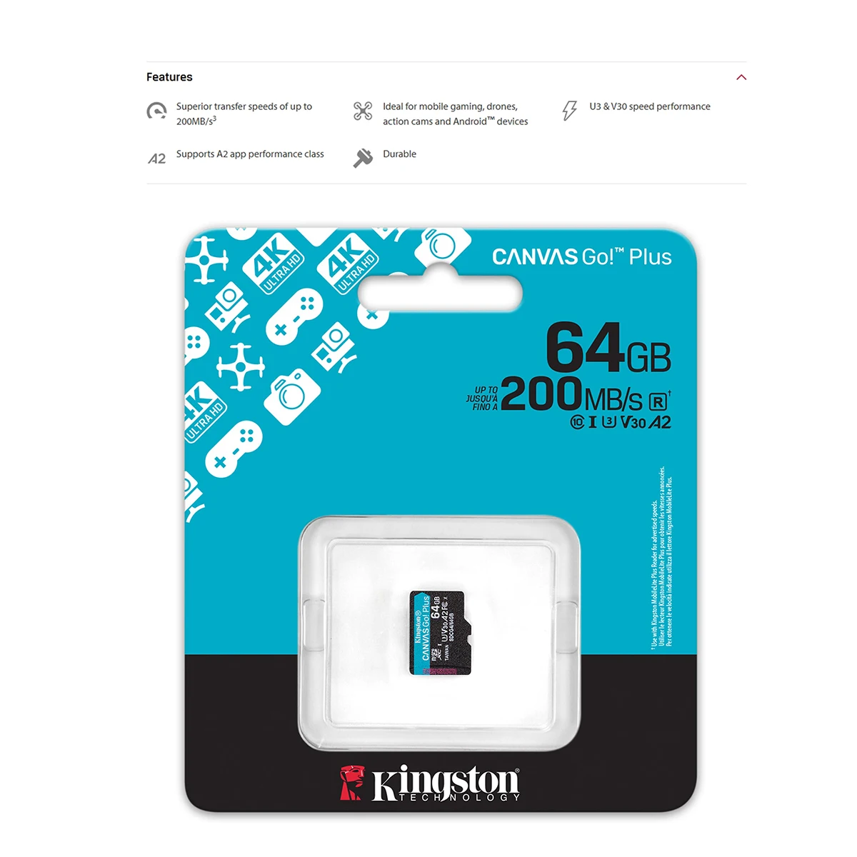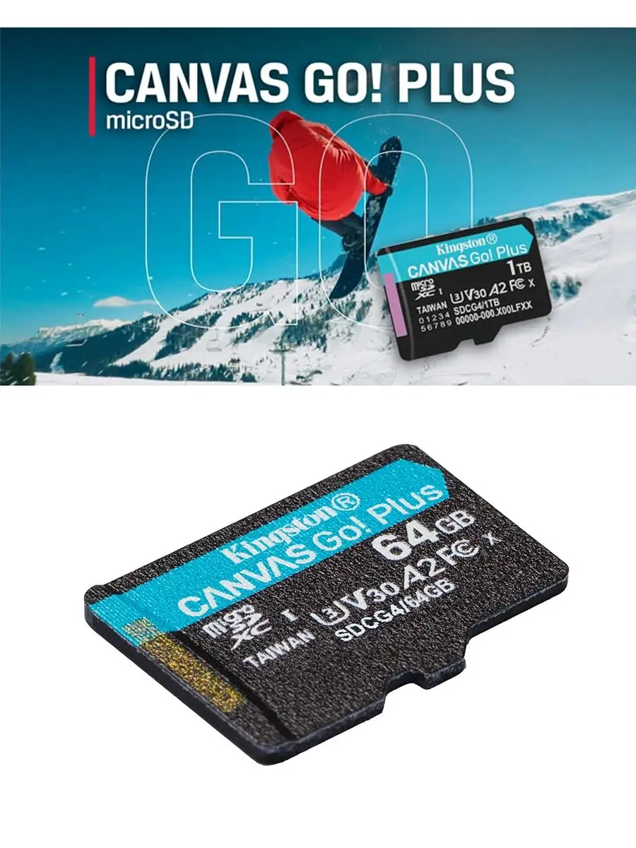 ¡El lienzo de Kingston Go!Además microSD está diseñado para buscadores de aventuras y jugadores móviles que exigen un alto rendimiento en movimiento.Con velocidades de transferencia ultrarrápidas de hasta 200 MB/s1 , agiliza su flujo de trabajo, permitiéndole pasar más tiempo capturando y creando.
