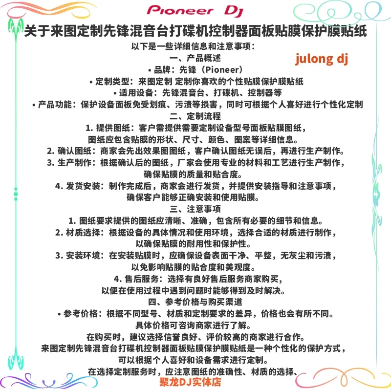 Notas: 1.Productos Marca: pionero Tipo: Personaliza la imagen Equipo aplicable: mezclador pionero, reproductor de discos, controlador, etc. Función del producto: Proteja el panel del equipo contra rasguños, manchas, etc., y personalícelo según sus preferencias. 2.Proceso de personalización 1.Proporcionar dibujos: los clientes proporcionan dibujos para películas de paneles que requieren modelos de equipos personalizados.Los dibujos deben ser claros y precisos, incluidos todos los detalles e información necesarios. 2.Confirme los dibujos: El comerciante primero producirá las representaciones y los dibujos, y el cliente confirmará que los dibujos son correctos antes de la producción y la producción. 3.Producción y producción: Según los dibujos confirmados, el fabricante utilizará materiales y procesos profesionales para producir para garantizar la calidad y el ajuste de la película. 4.Entrega: Una vez completada la producción, el comerciante entregará la mercancía. 5. Película: El cliente debe poder instalarlo correctamente. Antes de instalar la película, el equipo debe tener una superficie limpia y plana, libre de polvo y manchas. Si no sabe cómo aplicar la película, consúlela a profesionales para que la aplique para evitar que los métodos personales afecten el ajuste y la estética de la película.