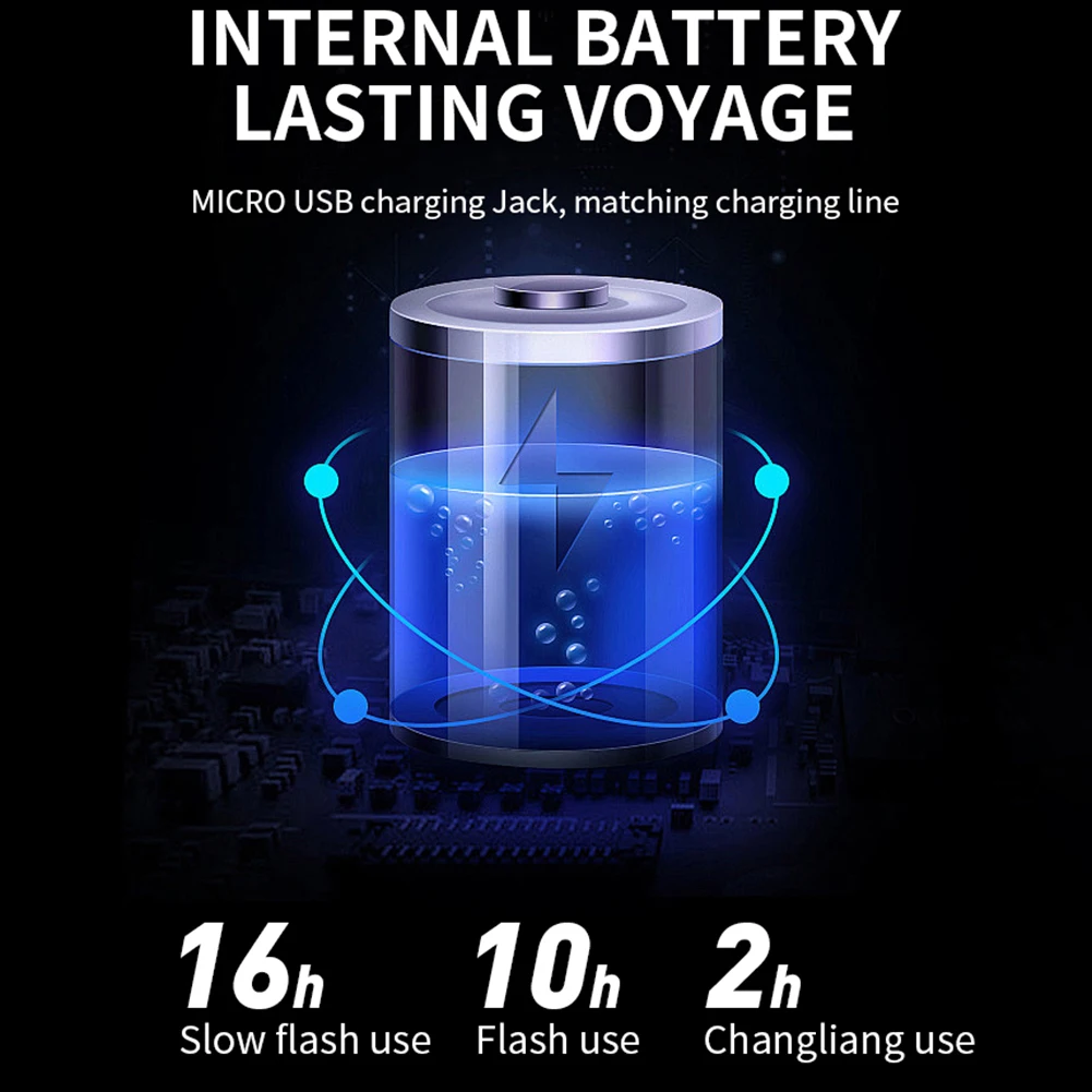 Modo de iluminación: Flash rápido de siete colores, Flash lento de siete colores, modo SOS de siete colores, luz constante de cuatro colores, modo de aviación civil, Modo de ciclo y otros 30 modos, con función de memoria