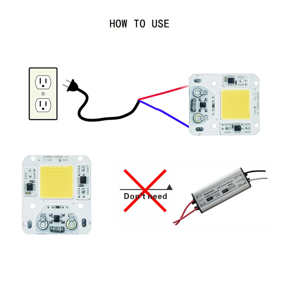 Conéctese a la alimentación de 220V CA directamente, no necesita controlador. Voltios de entrada: CA 220V/CA 110V Eficacia luminosa: 100-110LM/W 2 años de garantía (el doble que la mayoría de los competidores) Atención: se necesitan piezas de refrigeración (disipador térmico o disipador térmico + ventilador). No lo encienda solo sin enfriar. De lo contrario, puede quemarse pronto.