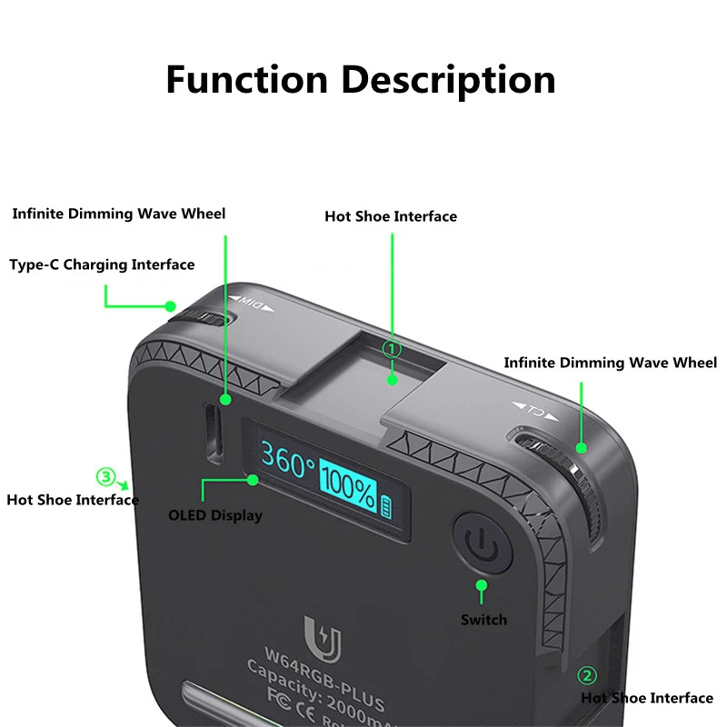Batería de iones de litio recargable integrada de 3,7 V y 2000mAh, con puerto de carga tipo C. Potencia suficiente para durar 1,5 horas con el brillo máximo o durante 5 horas con el brillo mínimo. No tenga nada que preocuparse por la fuente de alimentación cuando haga iluminación fotográfica o grabación de video al aire libre, transmisión en vivo.