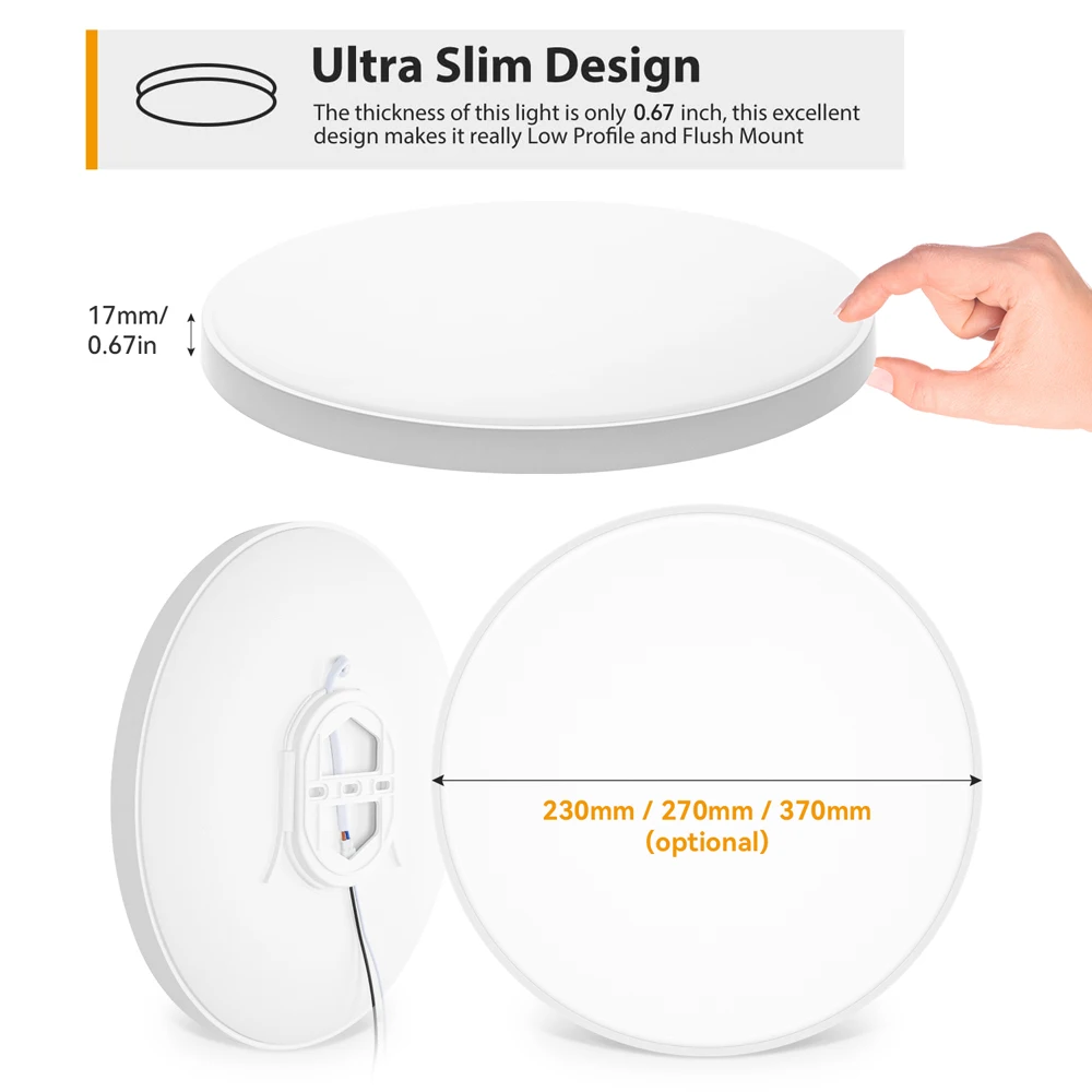 1. Diseño elegante y delgado. Esta delgada luz de techo LED empotrada brillante con diseño delgado, no se verá incómoda ni afectará la decoración. Las lámparas de techo montadas en superficie tienen una superficie simple y elegante, lo que las hace adecuadas para una variedad de estilos decorativos. 3 tamaños diferentes 230mm/ 270mm/ 370mm disponibles.