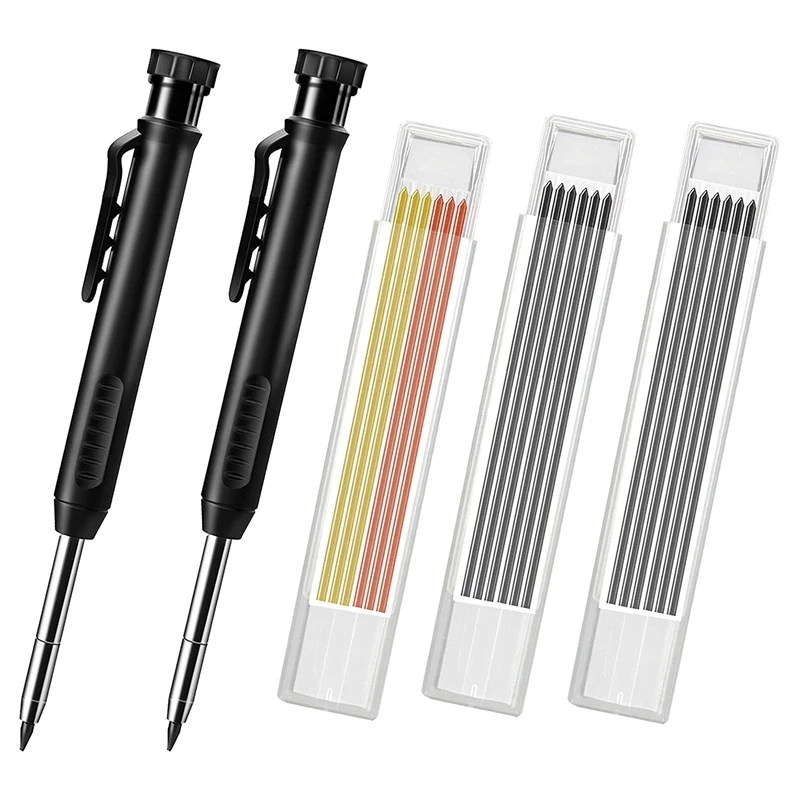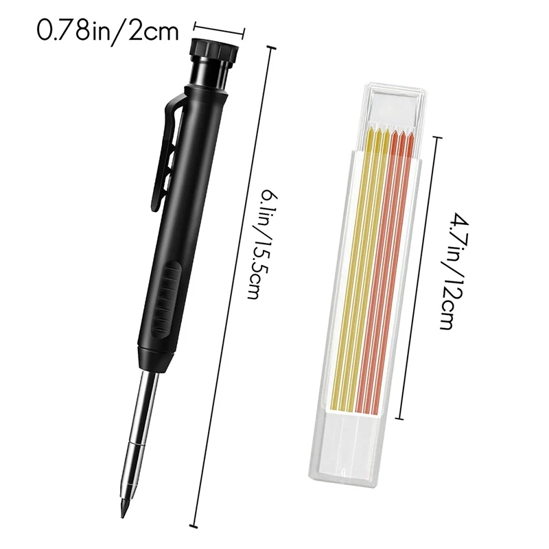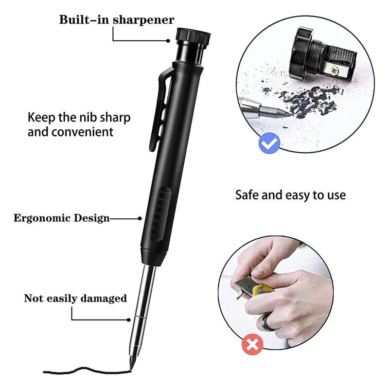 Diseño de orificio profundo: este lápiz para trabajar la madera tiene una punta extendida, que puede llegar fácilmente a lugares que son difíciles de marcar con otros marcadores para trabajar la madera.Se agrega una ranura al cuerpo del bolígrafo para aumentar la fricción al sostener el bolígrafo y reducir el dolor durante el trabajo prolongado.