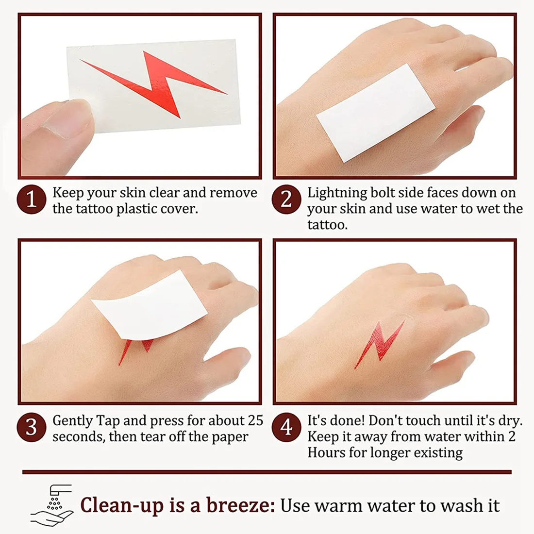 Amplia gama de aplicaciones: lápices de palo de madera y pernos de iluminación. Los tatuajes temporales se pueden utilizar para fiestas temáticas de magos, fiestas de Halloween, fiestas de cumpleaños, decoraciones de fiesta, accesorios de cosplay o como regalos de cumpleaños para niños.