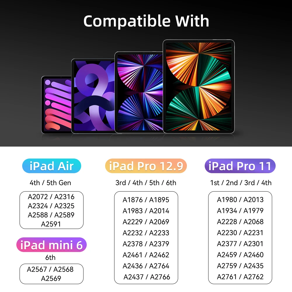 Please confirm whether your devices are compatible with our iPad pencil before you place orders. Compatible Models: iPad mini (6th generation), iPad Pro 12.9-inch(3rd, 4th, and 5th 6th generation), iPad Pro 11-inch(1st, 2nd, 3rd and 4th generation), iPad Air(4th and 5th generation). Other models of iPad don't have magnetic charging capabilities, Requires purchase of charger option, iPads released before 2018 are not suitable.