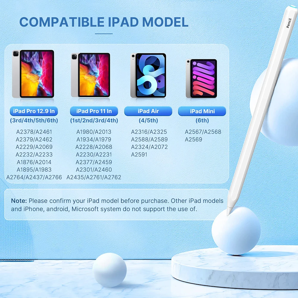 Please confirm whether your devices are compatible with our iPad pencil before you place orders. Compatible Models: iPad mini (6th generation), iPad Pro 12.9-inch(3rd, 4th, and 5th 6th generation), iPad Pro 11-inch(1st, 2nd, 3rd and 4th generation), iPad Air(4th and 5th generation). Other models of iPad don't have magnetic charging capabilities, Requires purchase of charger option, iPads released before 2018 are not suitable.