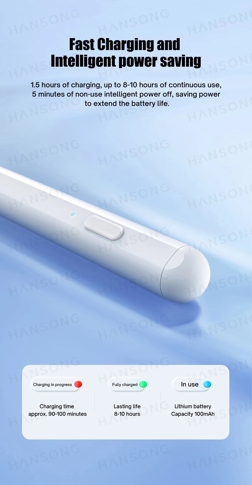 1,5 horas de carga, hasta 8-10 horas de uso continuo, 5 minutos de apagado inteligente sin uso, ahorrando energía para extender la vida útil de la batería.