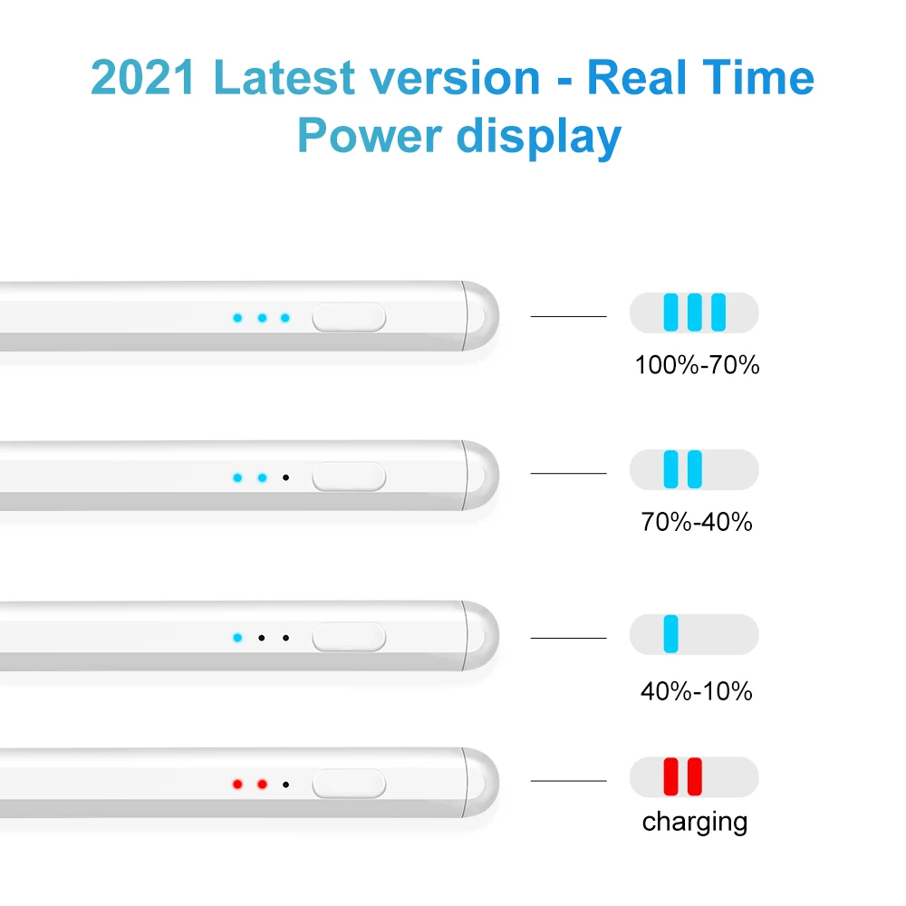 El último lápiz óptico 2021 está equipado con un indicador de batería, que monitoriza la batería en tiempo real. Si la luz parpadea, te recordará que lo cargues.