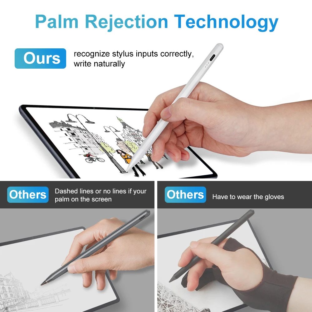 Bolígrafo de iPad mejorado con tecnología de rechazo de Palma, puede descansar la palma de la mano en la pantalla del iPad sin un guante incómodo mientras escribe o dibuja. Al igual que los bolígrafos reales, proporciona una sensación de escritura natural y suave. Recomendamos que puedas usar este bolígrafo en el iPad con un protector de pantalla de vidrio.