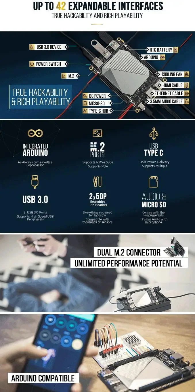 • GPIO y otras características: 2x50p GPIO incluyendo I2C, I2S, USB, TTL, UART, RTC, administración de energía, botón de encendido extensible, todo lo que necesita