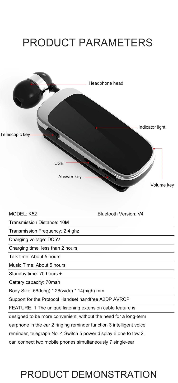 1. Nombre del producto: Auricular de Bluetooth del negocio K52