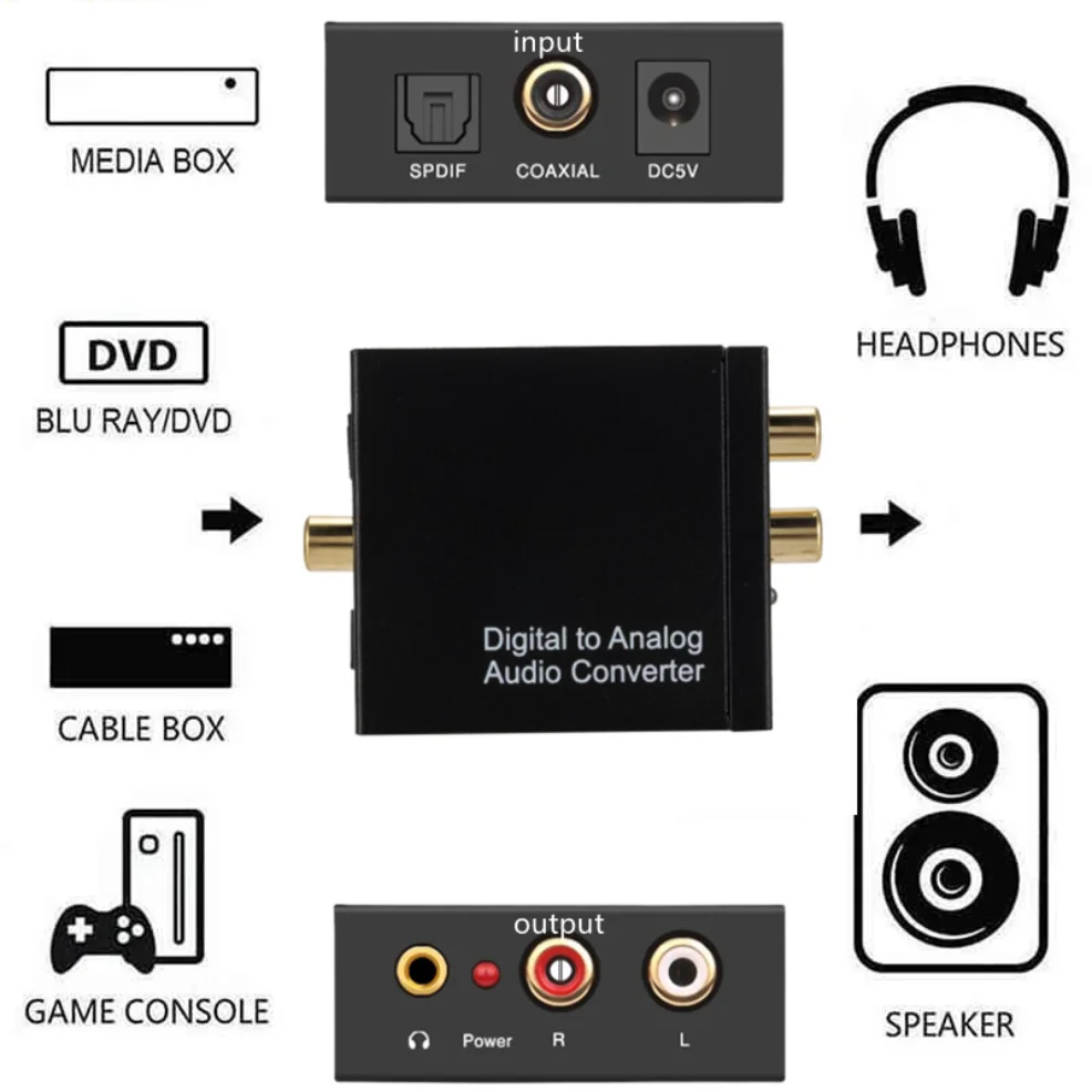 -Conector de entrada de audio: 1 x Toslink, 1 x RCA (coaxial); Conector de salida de audio: 2 x RCA(R/L), 1 x conector de 3,5mm; cable de alimentación USB aangedreven door de 5,5mm (el adaptador de corriente es NIET Inbegrepen); gebruik Geen Andere Stekkers, Het Kan Alleen Gebruik 5V 1APluk.
