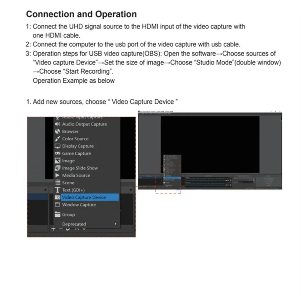 3: Pasos de operación para la captura de video USB (OBS): abra el software→Elija las fuentes de