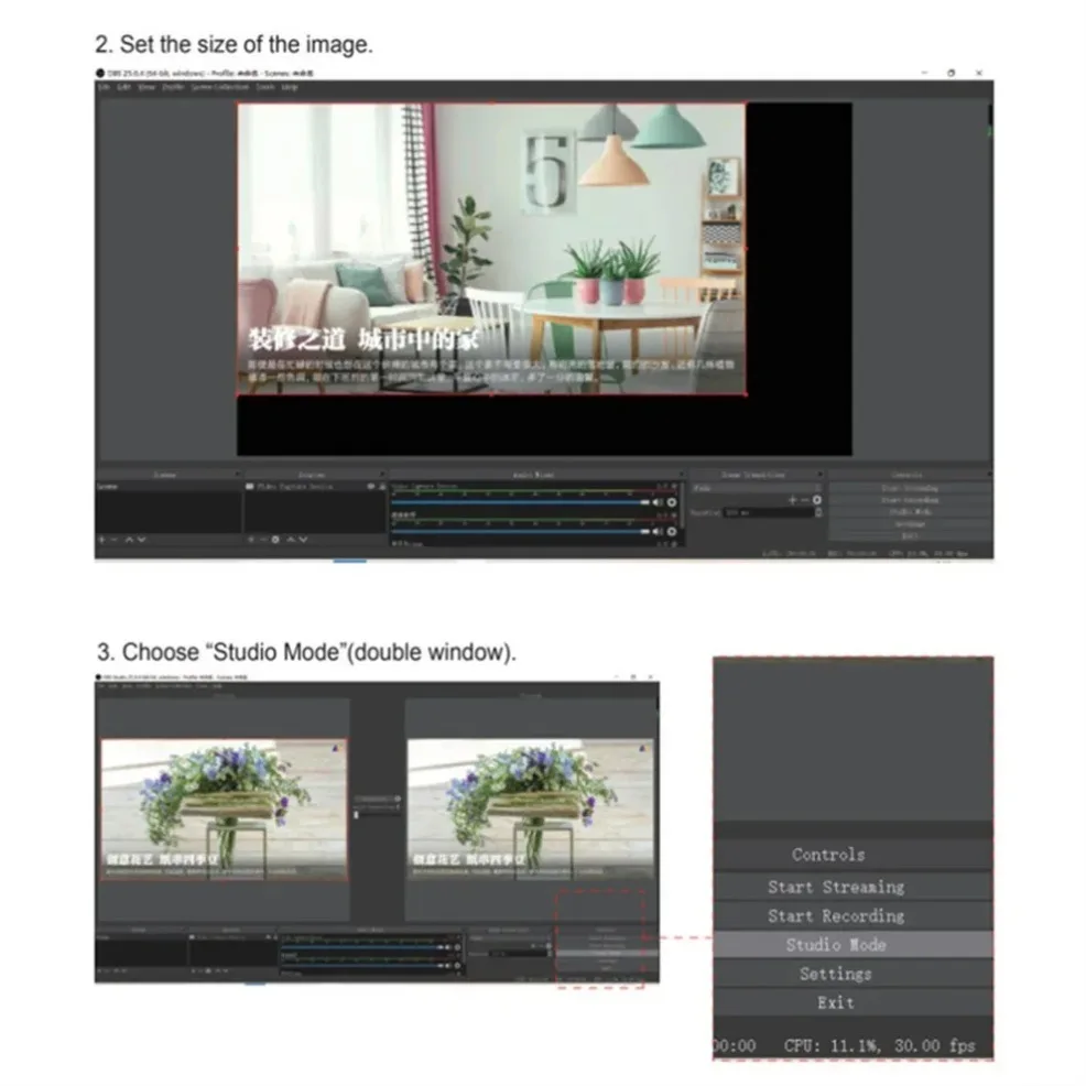"Dispositivo de captura de vídeo" →Establecer el tamaño de la imagen→Elija "Modo de estudio" (doble ventana)