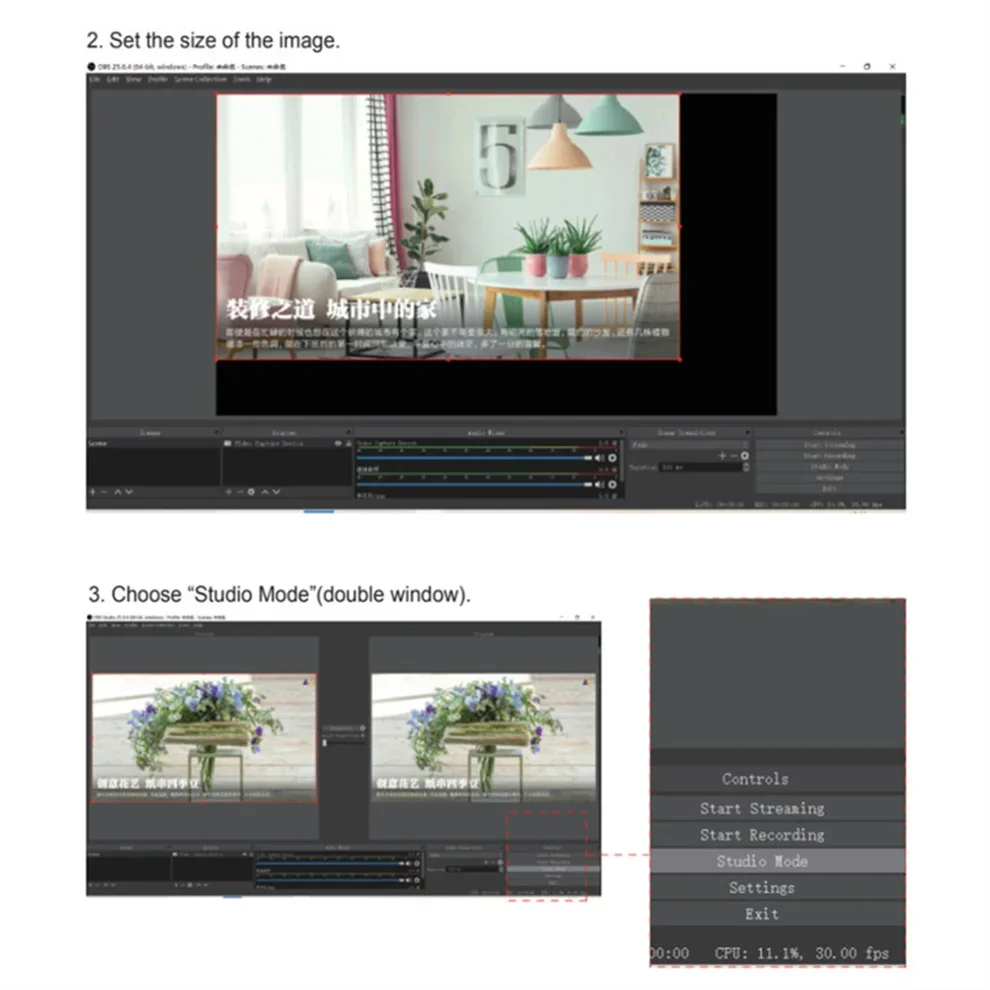 "Dispositivo de captura de vídeo"→Establezca el tamaño de la imagen→Elija "Modo de estudio"(doble ventana)