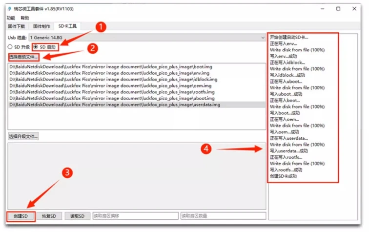Abra SocTooIKit y seleccione "de tarjeta SD Herramienta", formatee la tarjeta S e instálela en el lector de tarjetas y conéctela al ordenador. El tamaño de la tarjeta SD se mostrará debajo del disco USB. Si no se muestra, vuelva a insertar el lector de tarjetas y seleccione "Arranque SD". Seleccione el archivo de inicio (el archivo update.img no es necesario) y finalmente haga clic en "Crear SD". Una vez completada la creación, coloque la SD en la ranura de la placa de desarrollo para encender la prueba.