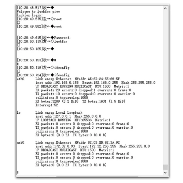 Inserte el cable de red en el puerto de red y conecte el PIN UART (2, 2, 2, 2, 2, 2). Después de encender la placa de desarrollo, el puerto serie emite una serie de información de inicio. Cuando se muestra LOGIN:, se envía el nombre de usuario root. Si aparece Contraseña:, puede iniciar sesión con la contraseña de luckfox y ejecutar el comando ifconfig para ver la dirección IP.