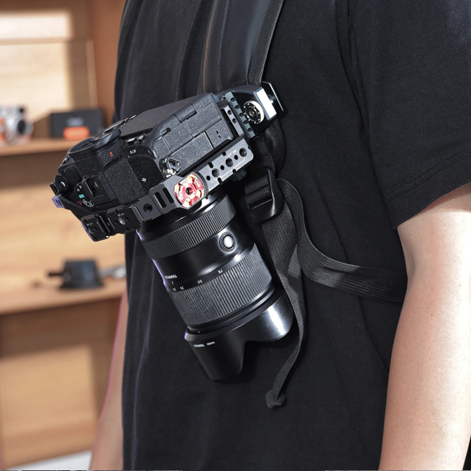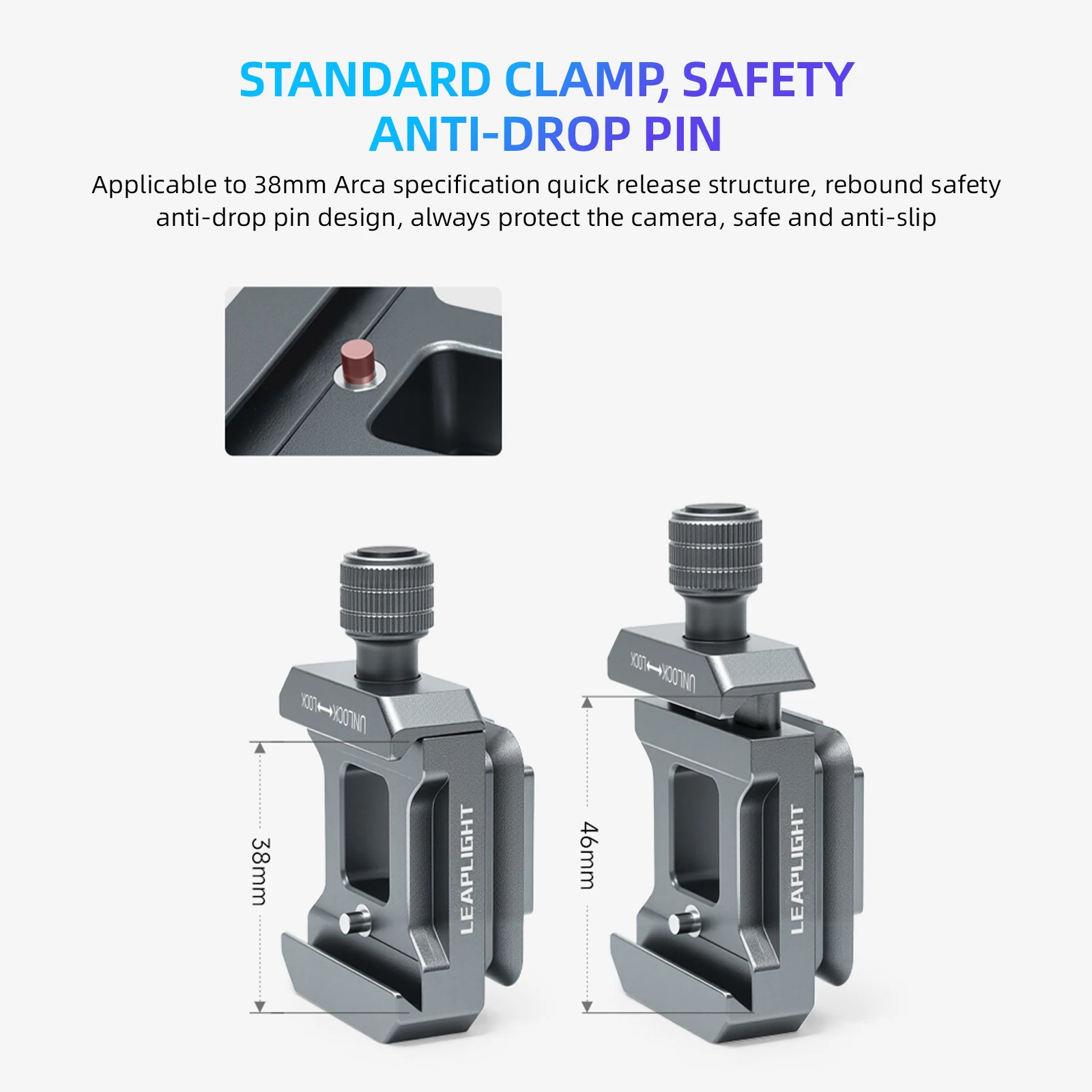 Pasador anticaída de seguridad: equipada con un pasador anticaída de seguridad de rebote, esta abrazadera de montaje asegura su cámara de manera efectiva, evitando caídas accidentales durante el uso.El diseño de seguridad de rebote garantiza que su equipo permanezca protegido en todo momento.
