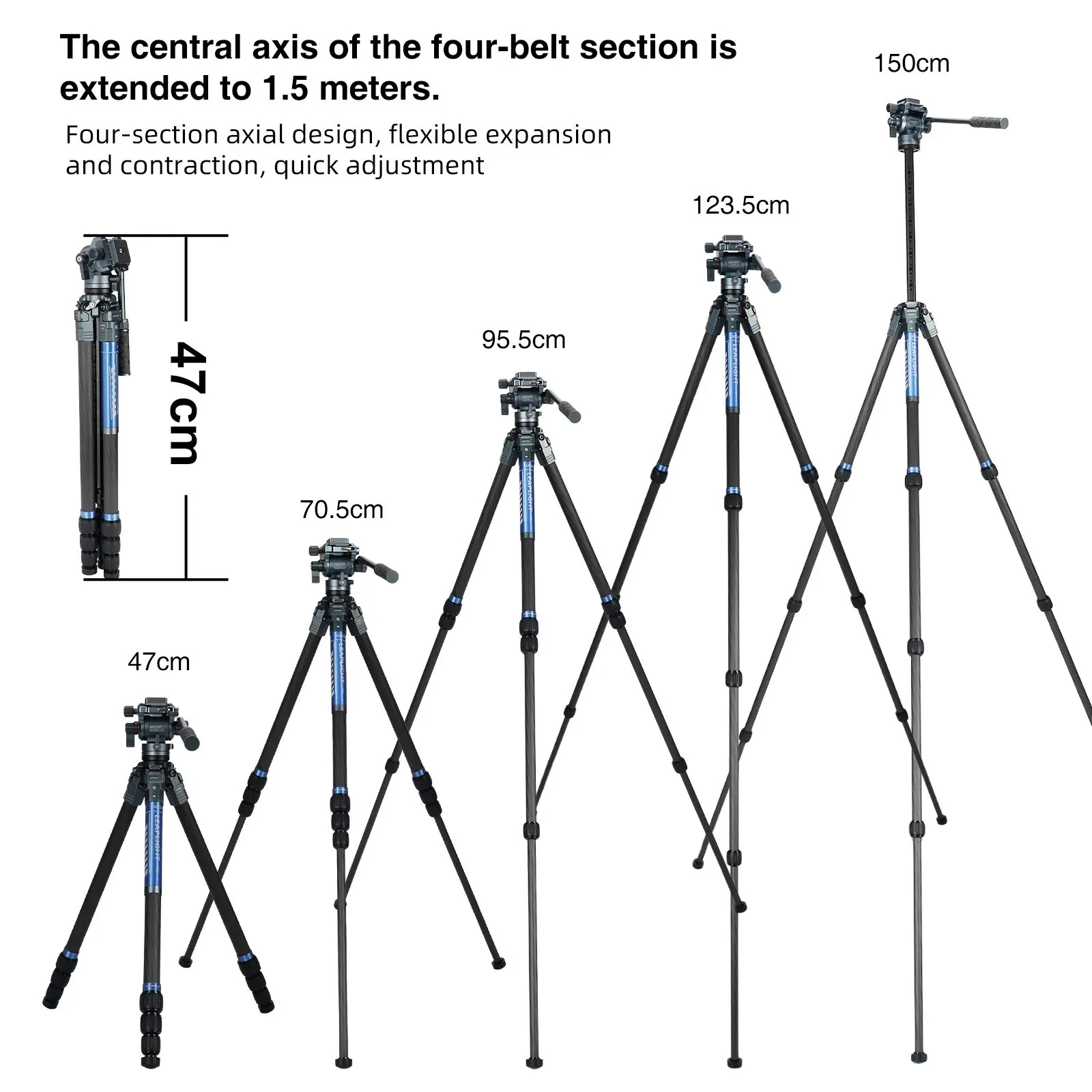 Ángulos y alturas ajustables: el trípode viene con tres ángulos de ajuste de la posición del pie, lo que le permite cambiar el ángulo de disparo y lograr tomas sólidas y estables.Además, la columna central de cuatro secciones puede extenderse hasta 1,5 metros, ofreciendo flexibilidad y ajustes rápidos de altura.El diseño de la columna central también permite disparos invertidos y de ángulo bajo, lo que le brinda más posibilidades creativas.