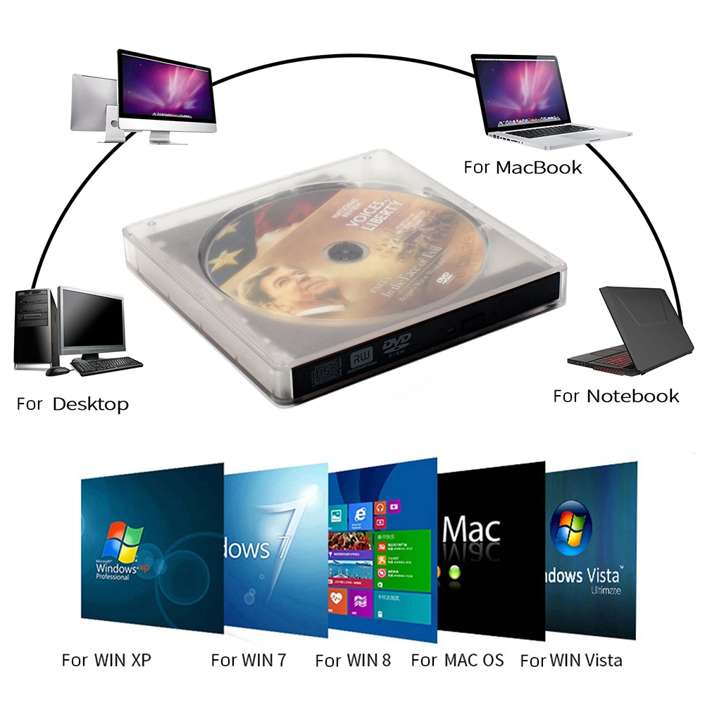 Comprar Lector de CD/DVD portátil USB 3,0 tipo C, unidad de DVD ultrafina Rom, controlador de DVD para exteriores, lector óptico con cancelación de ruido para escritorio