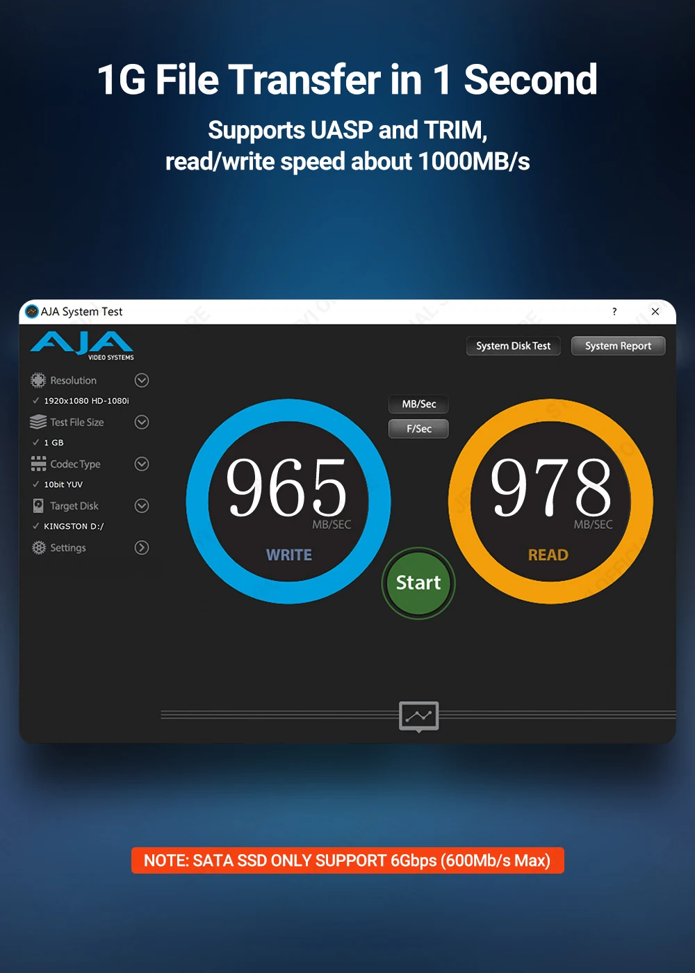 Este adaptador M.2 SSD a USB proporciona una transmisión de transferencia de datos estable y eficiente de 10 Gbps. El SSD basado en SATA M2 (tecla B+M) puede alcanzar 6 Gbps con este lector M.2.