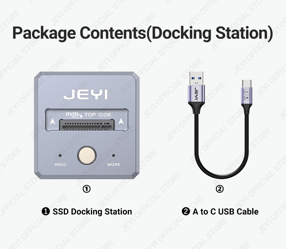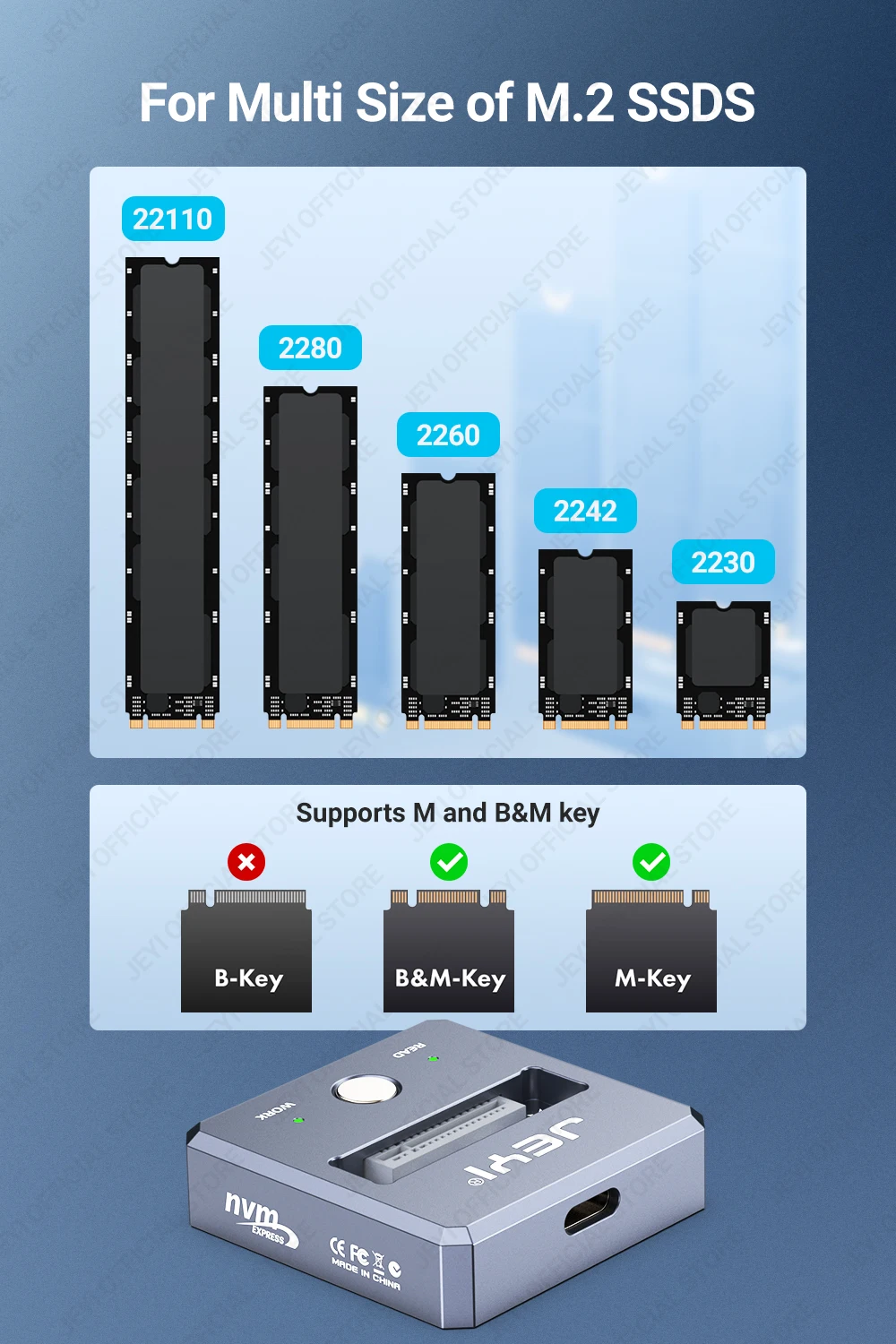 [Compatible con protocolos duales]: JEYI M.Dock 2 a USB compatible con SATA/NGFF y NVMe/PCIE en tamaños 2230/2242/2260/2280/22110, como M.2 claves NVMe/SATA B&M y SSD con clave NVMe/PCIe M, pero el lector SSD NO es compatible con M.2 SSD SATA AHCI B Key.