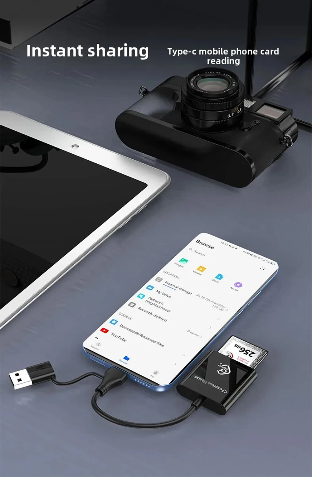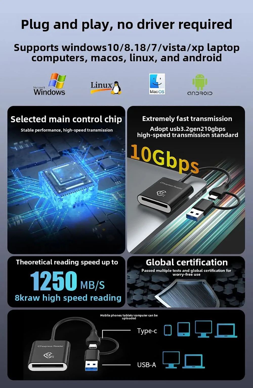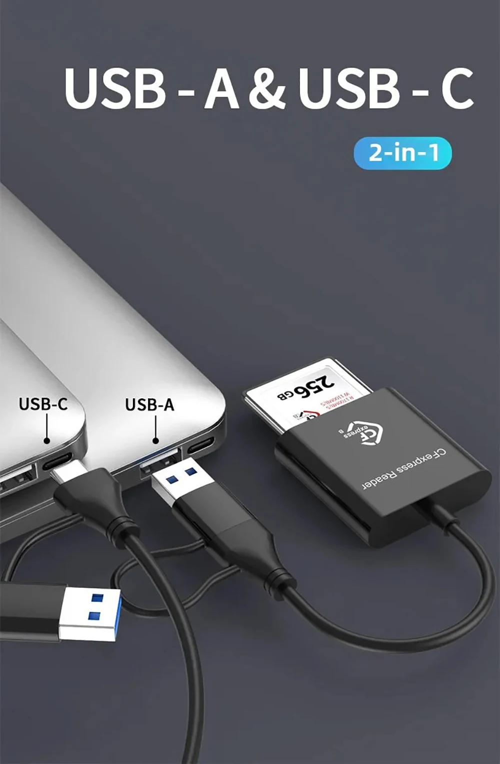 Cuenta con un enchufe de doble función con tipo C y USB-A, lo que lo hace adecuado para la conexión con computadoras de escritorio, portátiles y teléfonos móviles, satisfaciendo las necesidades de diferentes escenarios de uso.La carcasa de aleación de aluminio duradera y compacta garantiza una disipación de calor eficaz, proporcionando una garantía confiable para el funcionamiento continuo y eficiente del lector de tarjetas.La entrada de alimentación auxiliar USB-C garantiza un suministro de energía estable al dispositivo.Es plug-and-play, no requiere controladores adicionales y ofrece una amplia compatibilidad con varios sistemas, incluidos Android, Windows XP/Vista/7/8/8.1/10/11, Mac OS (incluidos sistemas con CPU M1 y M2), iOS y es compatible con teléfonos Apple de la serie 15.