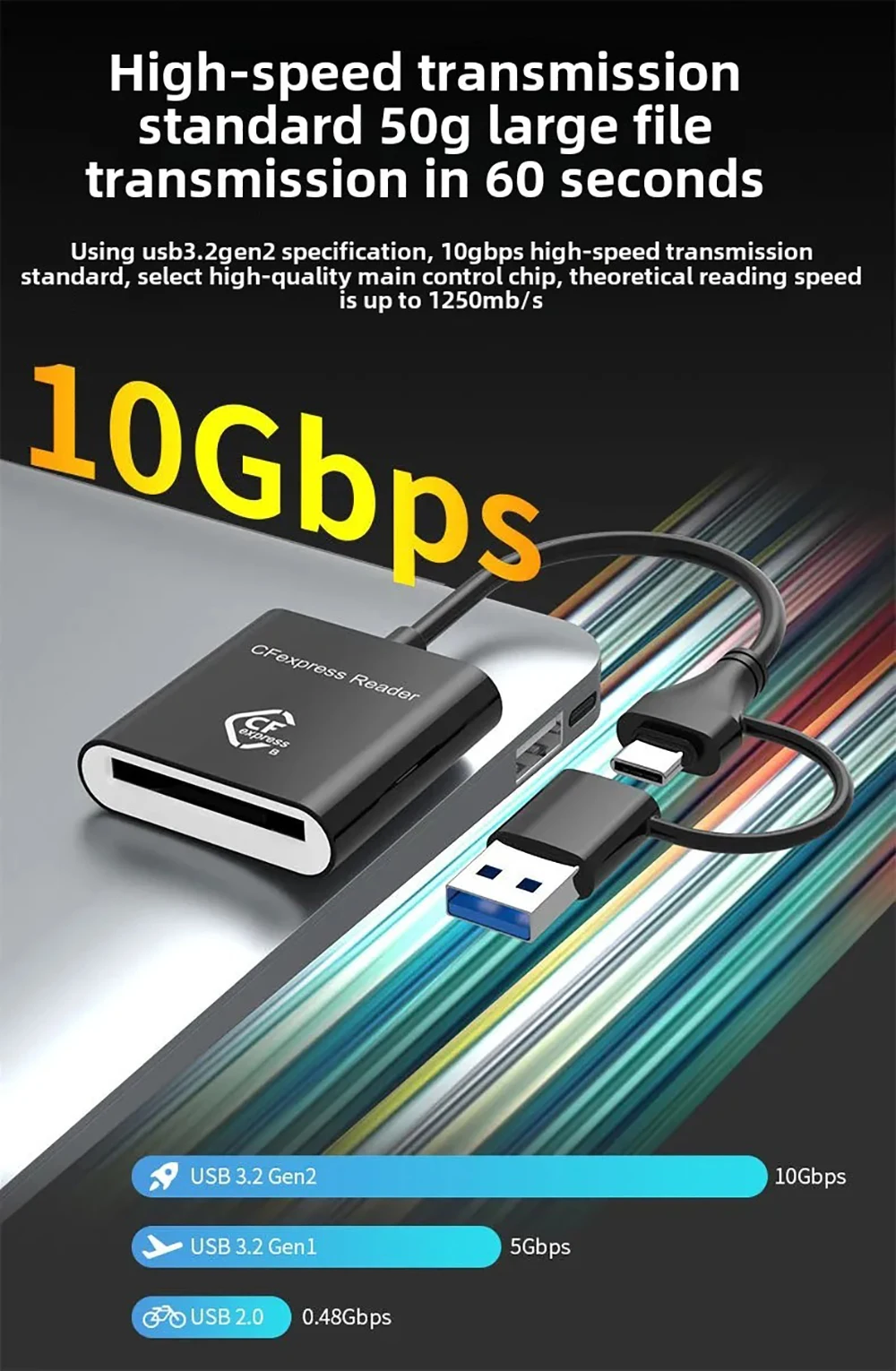 Utilizando la especificación usb3.2gen2, estándar de transmisión de alta velocidad de 10 Gbps, seleccione un chip de control principal de alta calidad, la velocidad de lectura teórica es de hasta 1250 MB/s Cumple con los requisitos de transmisión de alta velocidad de imágenes de 8 kraw
