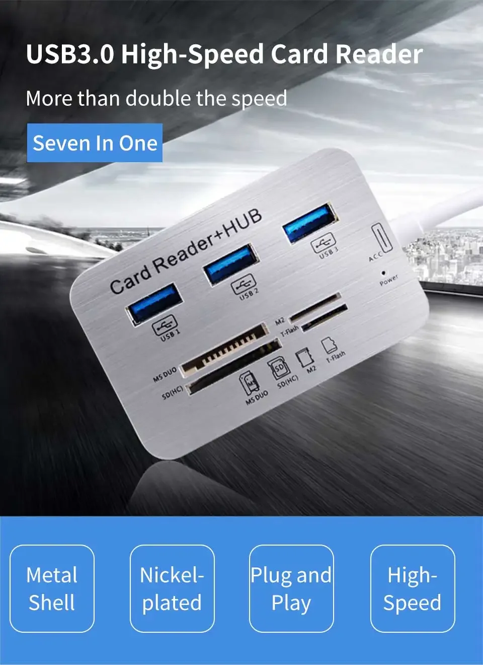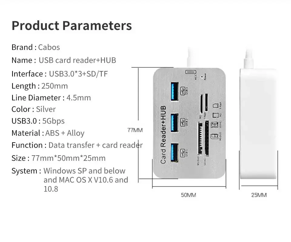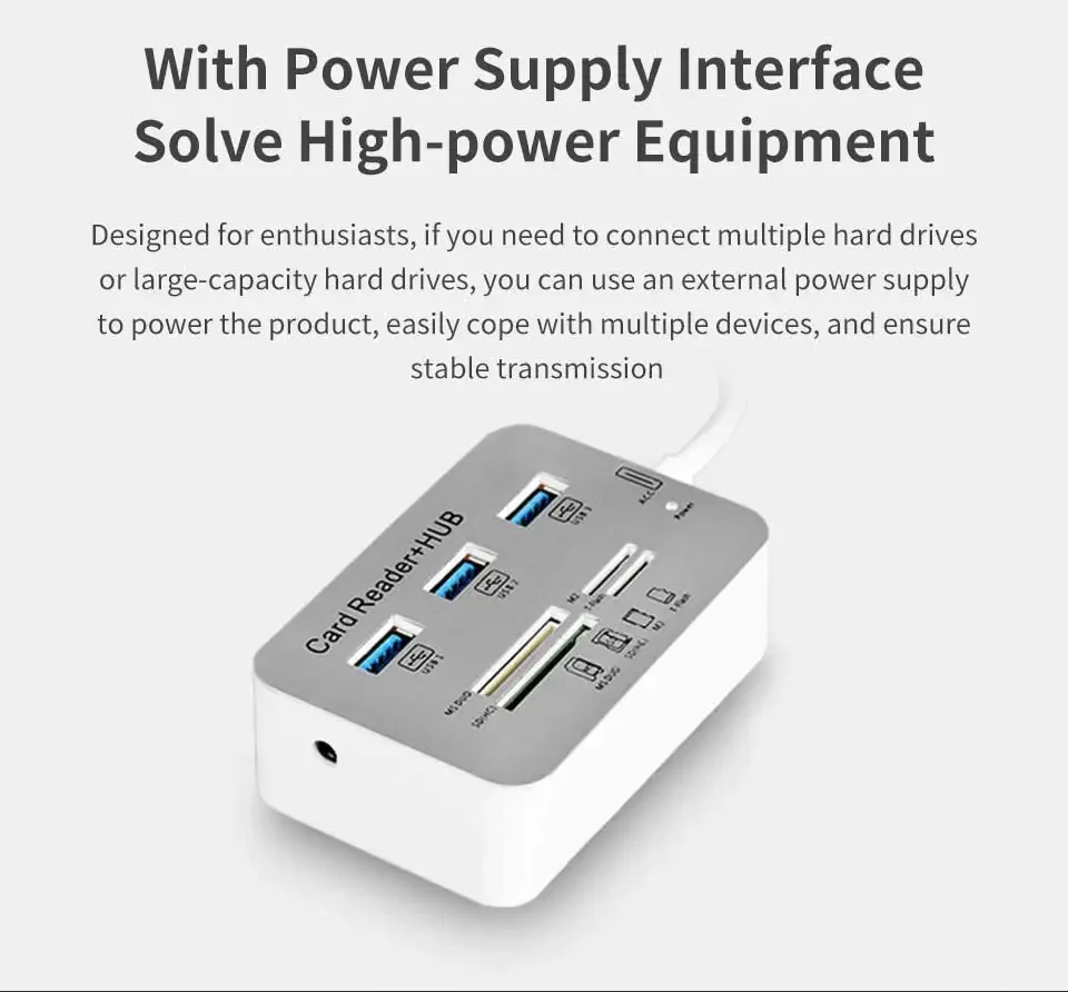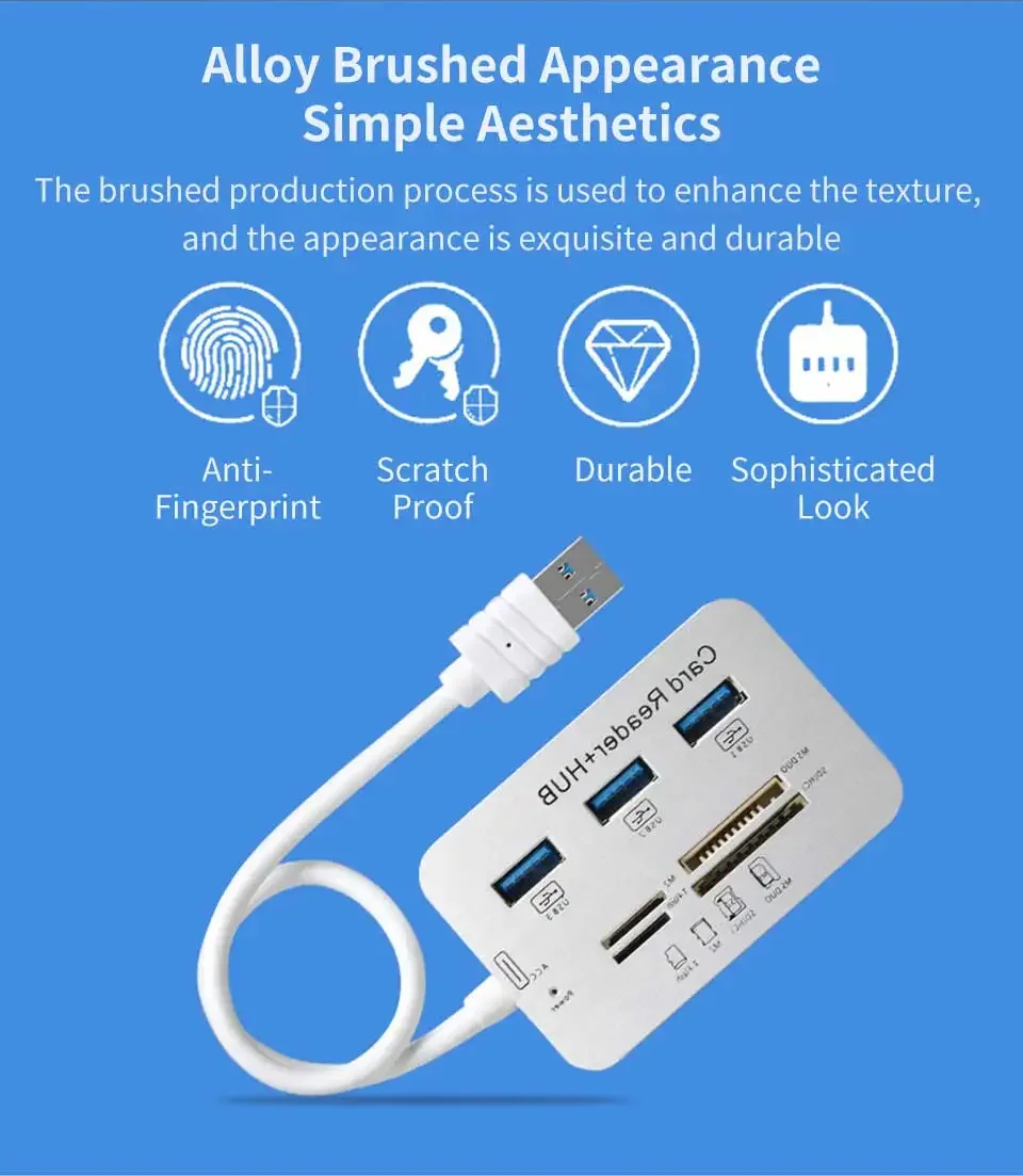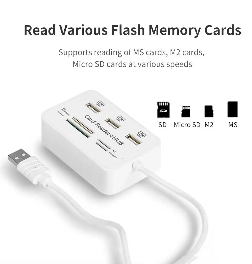 6953Lector de tarjetas Hub USB 7 en 1, expansor rápido USB3.0 o USB2.0, adaptador de tarjeta de memoria SD TF para disco U, PC, ratón, teclado, concentrador USBEspecificaciónUSB3.0: carcasa metálica + 3 puertos USB3.0 + lector de tarjetas de 4 puertosUSB2.0: carcasa de plástico + USB2.0 de 3 puertos + lector de tarjetas de 4 puertosAlta eficiencia :El concentrador USB 3.0/2.0 ayuda a ampliar el puerto USB de la PC de 1 a 7, agregar 3 puertos USB 3.0 y un combo de lector de tarjetas con ranuras MS/M2/SD/TF, ampliar su único puerto USB para hacer más cosas al mismo tiempo..Lector de tarjetas versátil:Cuenta con ranuras para tarjetas SD (UHS-I), TF, MS, M2, lo que facilita la lectura de diferentes tipos de tarjetas de memoria, ya no es necesario comprar otro lector de tarjetas.Alta velocidad:Este concentrador USB 3.0 tiene un ancho de banda de transmisión de alta velocidad de 5 Gbps, lo que permite transferir datos sin problemas sin bloquearlos.Se completa una copia de una película de definición estándar en 10 segundos.Los datos del archivo de datos se completan instantáneamente, que es 10 veces más rápido que USB2.0.Ampliamente compatible:El concentrador USB compatible con Windows XP/Vista/7/8/8,1/10, Mac OS, Linux, Chrome OS.Plug and play, sin necesidad de controladores ni instalación complicados, simplemente conecte sus dispositivos para una transferencia de datos rápida y segura.Compatible con dispositivos USB y memoria: