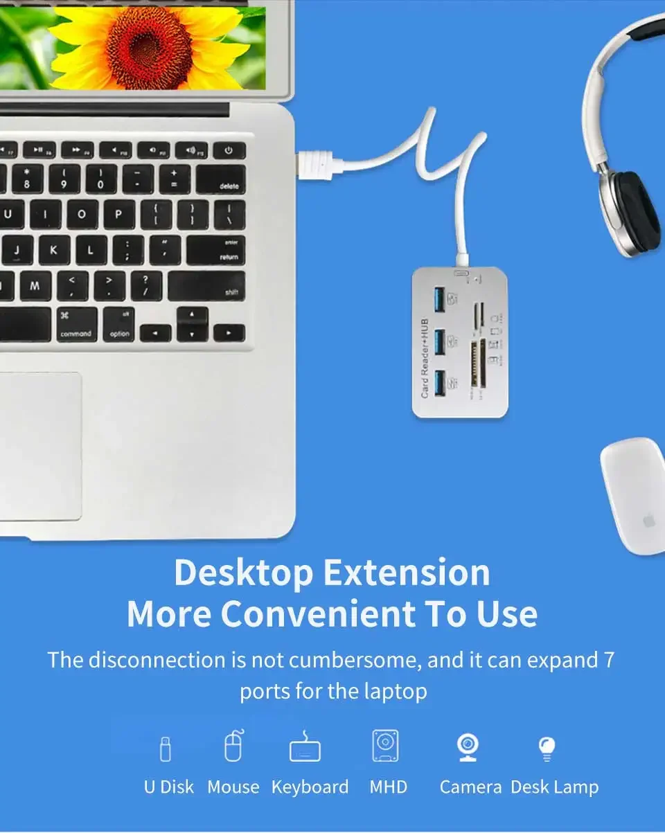 Lector de tarjetas con concentrador USB 7 en 1, expansor rápido USB 3,0 o USB 2,0, adaptador de tarjeta de memoria SD TF para disco U, PC, portátil, ratón, teclado