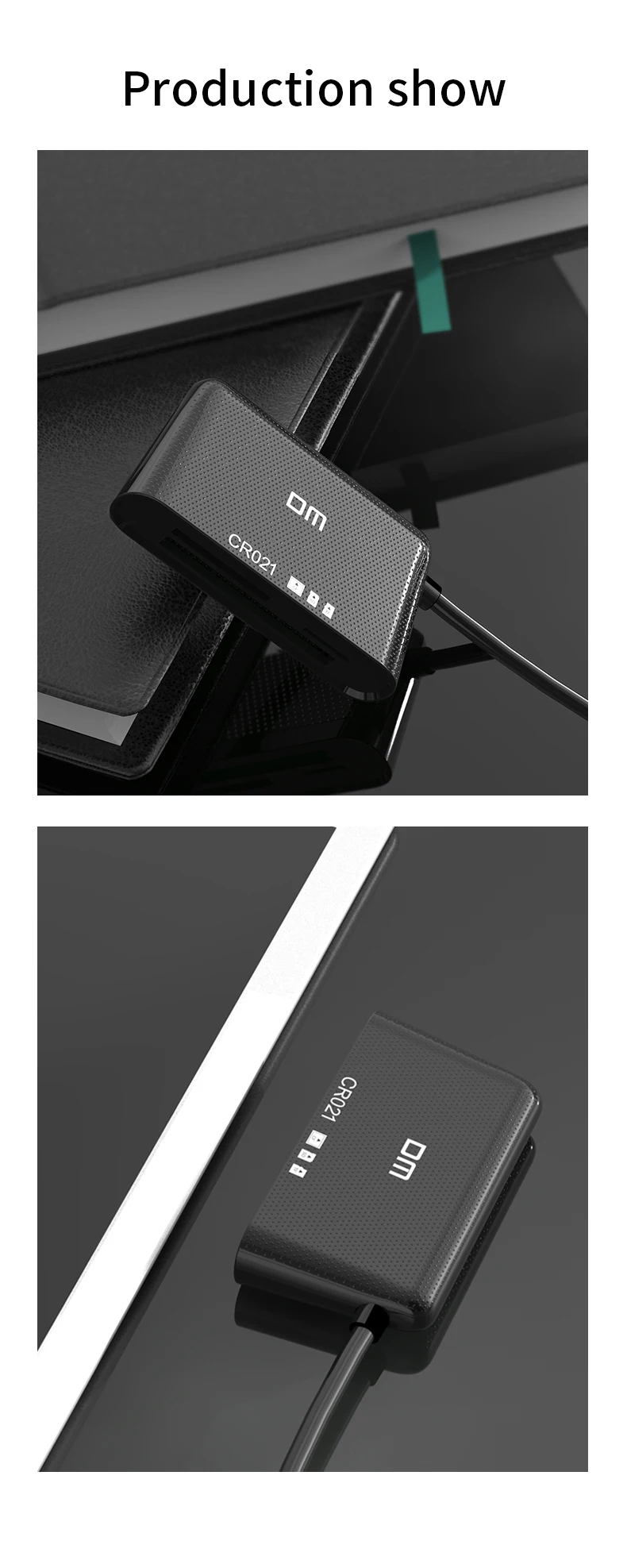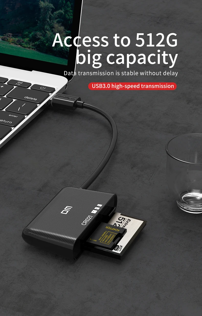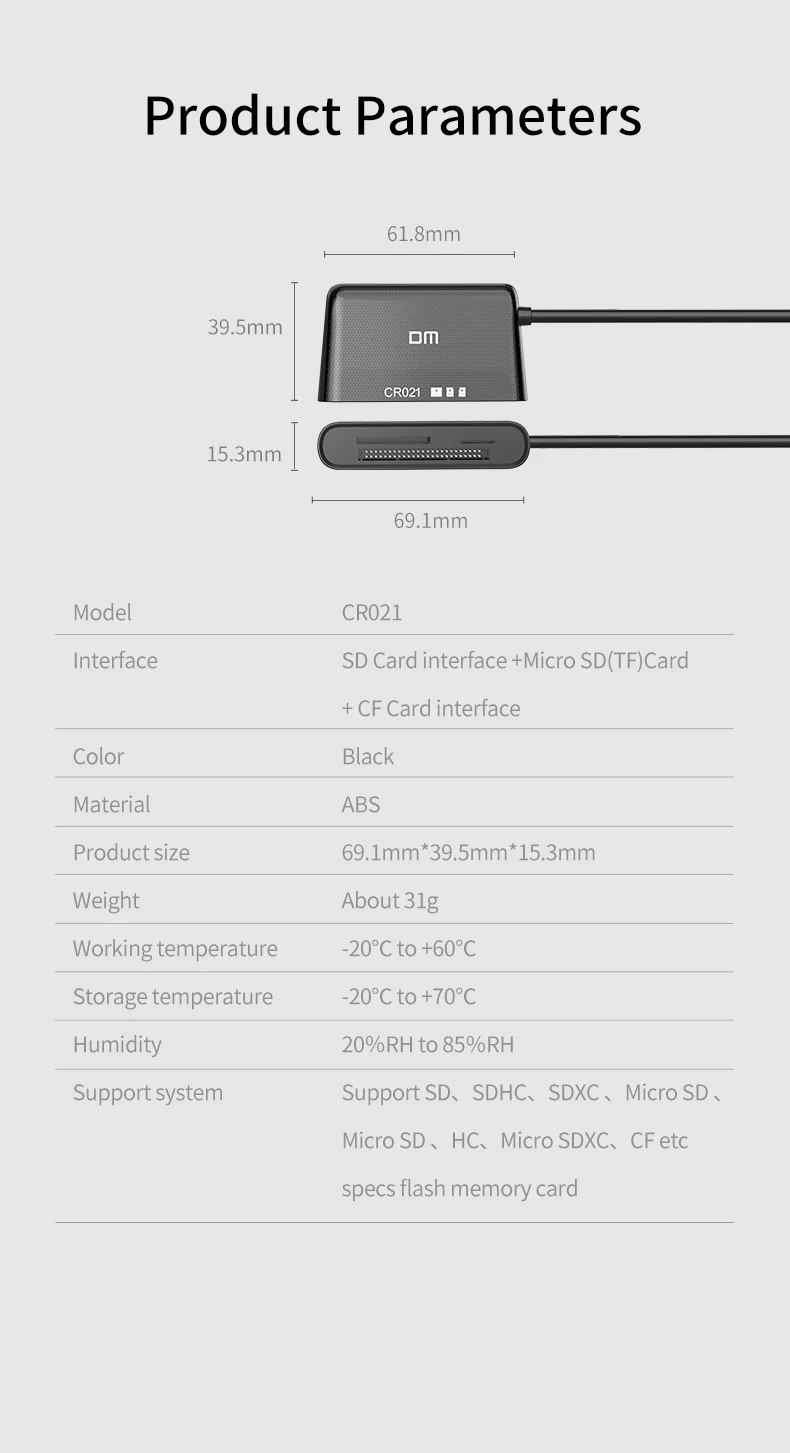Lector de tarjetas DM 3 en 1 CR021 Lector de tarjetas SD/TF/CF Muldti con interfaz USB Material: ABS Peso: 31G Peso bruto: 41g Capacidad de soporte: máximo 512G Tamaño del producto (largo x ancho x Alto): 6,91*3,95*1,53 cm Tamaño del paquete (largo x ancho x Alto): 12*10*1,4 cm Contenido del paquete: 1 x lector de tarjetas DM Observación: lector de tarjetas solamente, no incluye tarjeta Micro SD/tarjeta TF