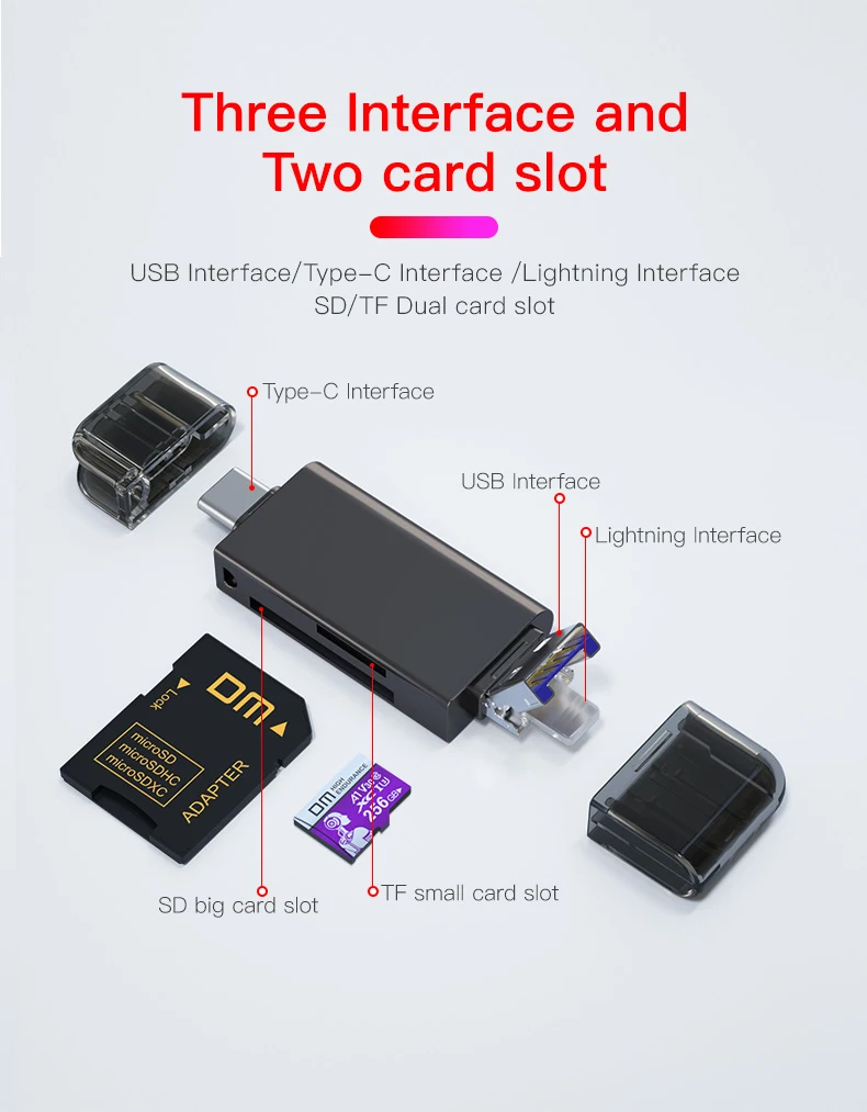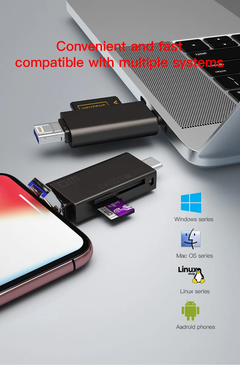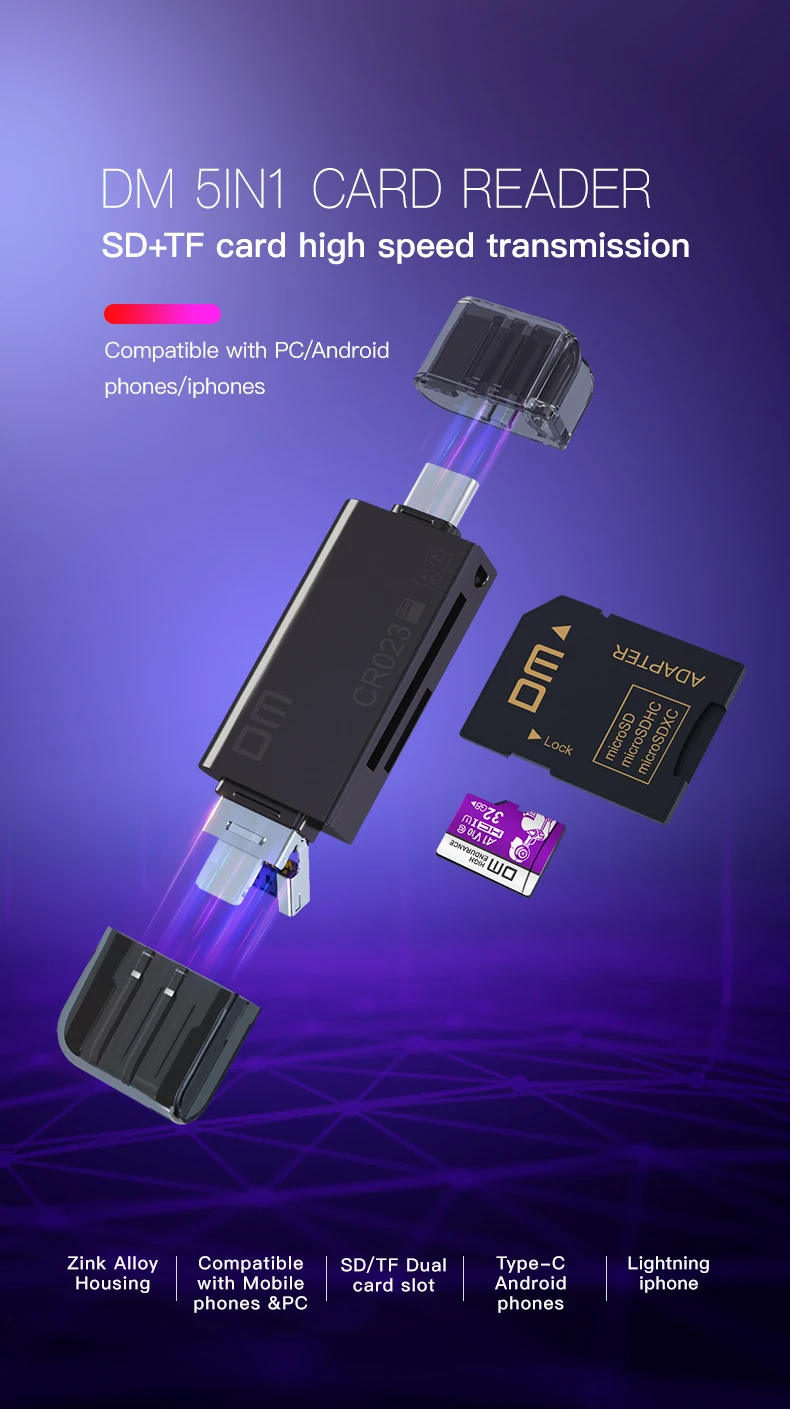 Lector de tarjetas DM 5 en 1 CR023 SD/TF Lector de tarjetas Muldti con USB relámpago y interfaz micro usb