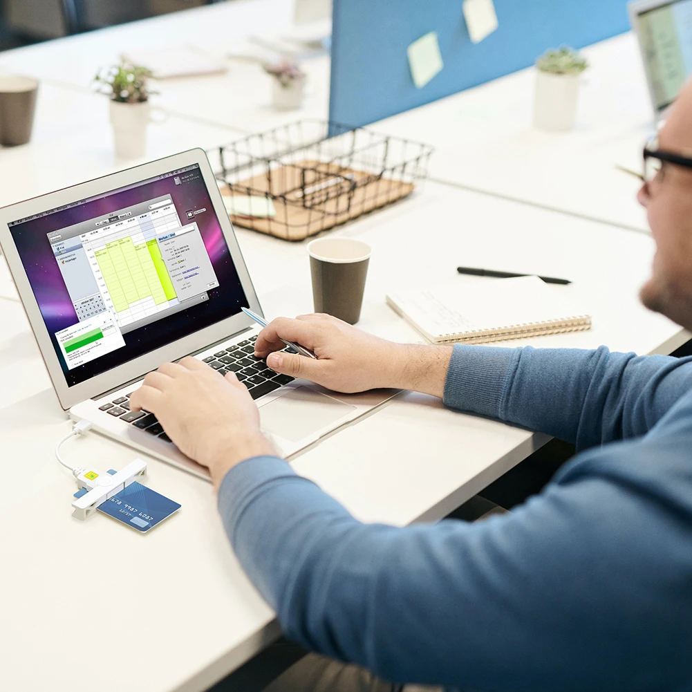 3.Compatibilidad Plug-and-Play:Disfrute de una conectividad perfecta con este lector de tarjetas inteligentes, ya que es compatible con plataformas Windows, Mac OS y Android.Simplemente conéctelo y funcionará sin esfuerzo en múltiples sistemas operativos. Ya sea que esté usando una computadora de escritorio, una computadora portátil o un teléfono inteligente, este lector brinda compatibilidad universal y un funcionamiento sin problemas.