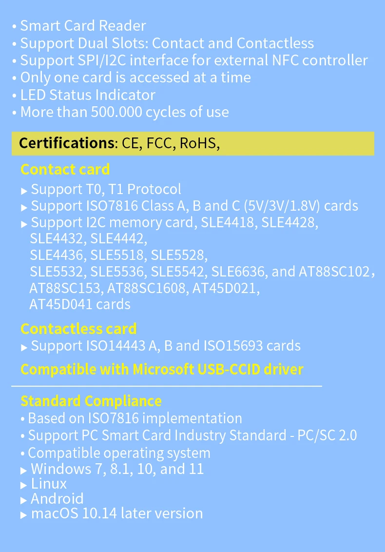 Soporta tarjetas ISO7816 Clase A, B y C (5V/3V/1.8V)