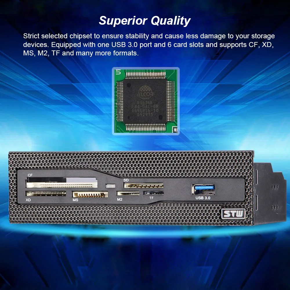 Este es un lector de tarjetas multifuncional que cuenta con un puerto USB 3,0 y 6 ranuras para tarjetas. Es compatible con CF, XD, MS, M2, TF y muchos más formatos, y le permite transferir archivos entre sus medios Flash y el ordenador de forma fácil y rápida. Los usuarios pueden transferir archivos fácil y rápidamente con la interfaz USB 3,0 de alta velocidad, ya que USB 3,0 permite una velocidad de transferencia de datos de hasta 5 Gb/s casi 10 veces más rápida que USB2.0. Se puede montar fácilmente en la bahía de la Unidad de 5,25 "de la carcasa de su ordenador para una mayor capacidad de lectura de tarjetas.