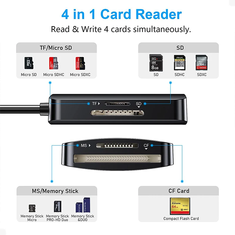 Comprar Lector de tarjetas de memoria USB 3,0 4 en 1 SD TF CF MS adaptador de tarjeta Flash compacto con acceso paralelo a 4 ranuras 5Gbps lectura escritura