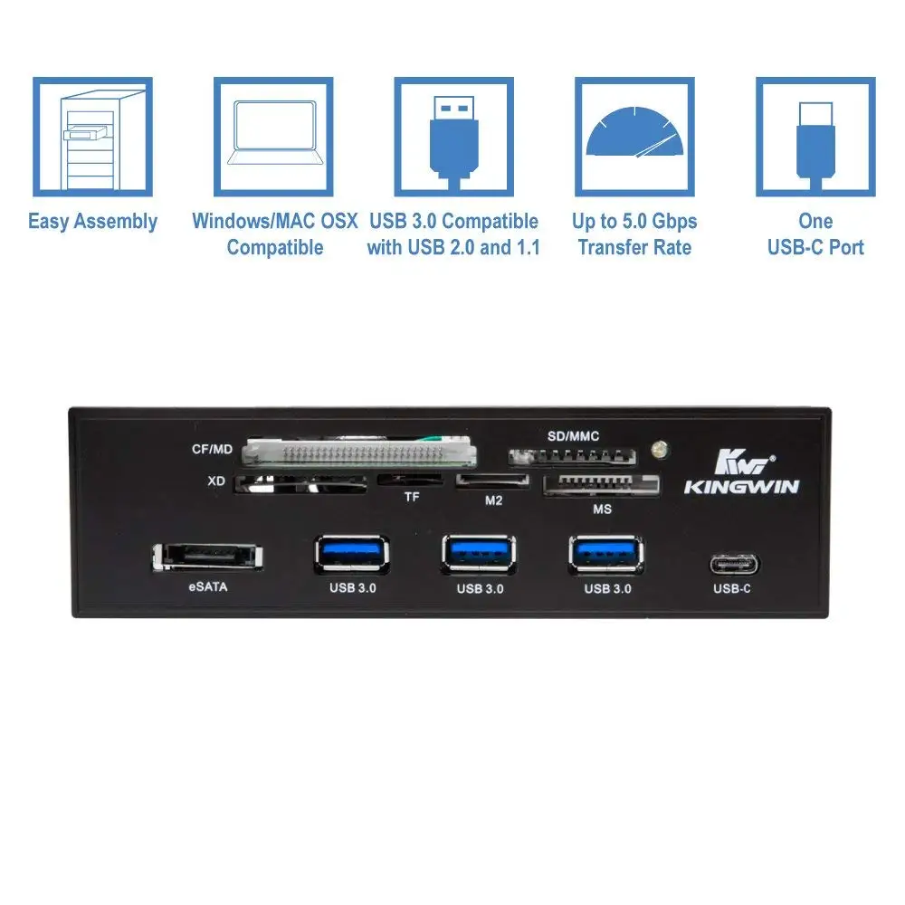 SD/MMC/SDHC, CF/CF II/HS CF/MD, MS/MS Duo/MS Pro, XD, TF/T-Flash, M2.El concentrador USB 3.0 también es compatible con versiones anteriores de USB 2.0/USB1.0/USB1.1. Proporciona fácil acceso a sus datos a través del panel frontal,