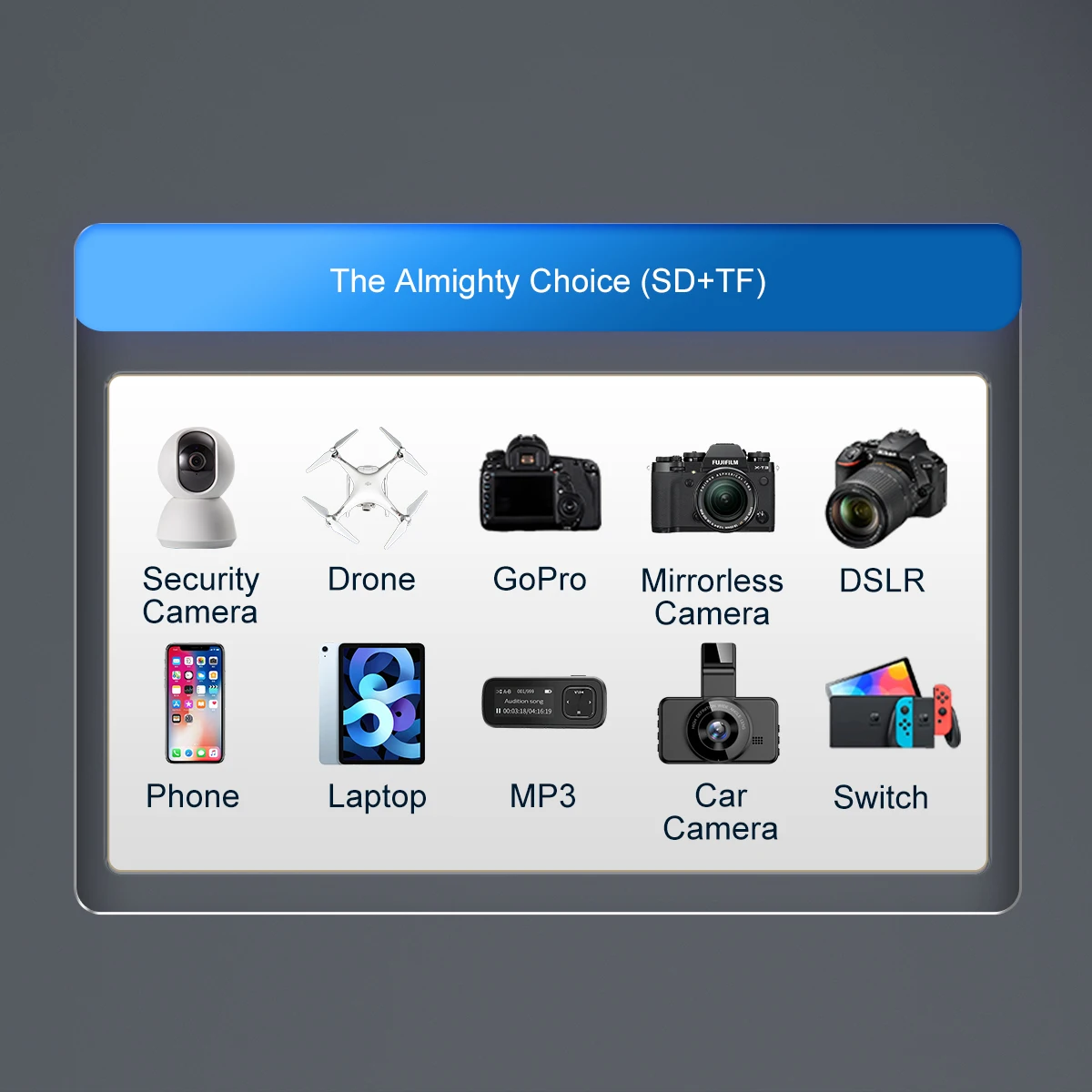 El lector de tarjetas admite lectura de tarjetas de memoria SD/TF de hasta 2T, lee más fácilmente la mayoría de las tarjetas de memoria.