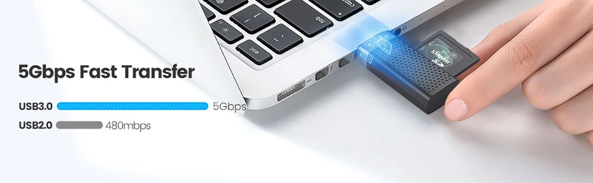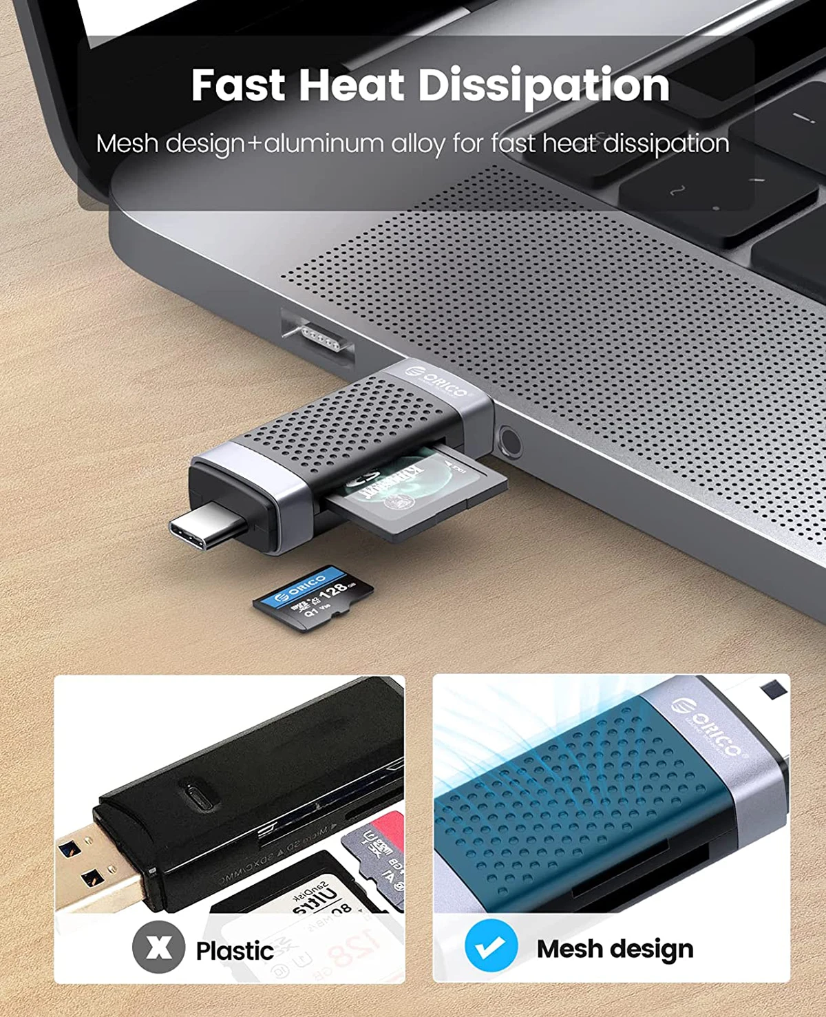 El lector de tarjetas de memoria está diseñado con un tamaño súper Mini, que puede poner en su maletín o bolsillo y usar en cualquier lugar. Diseño de malla + material ABS de aleación de aluminio, disipación de calor más rápida.