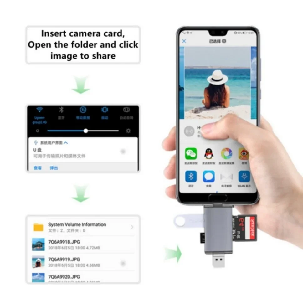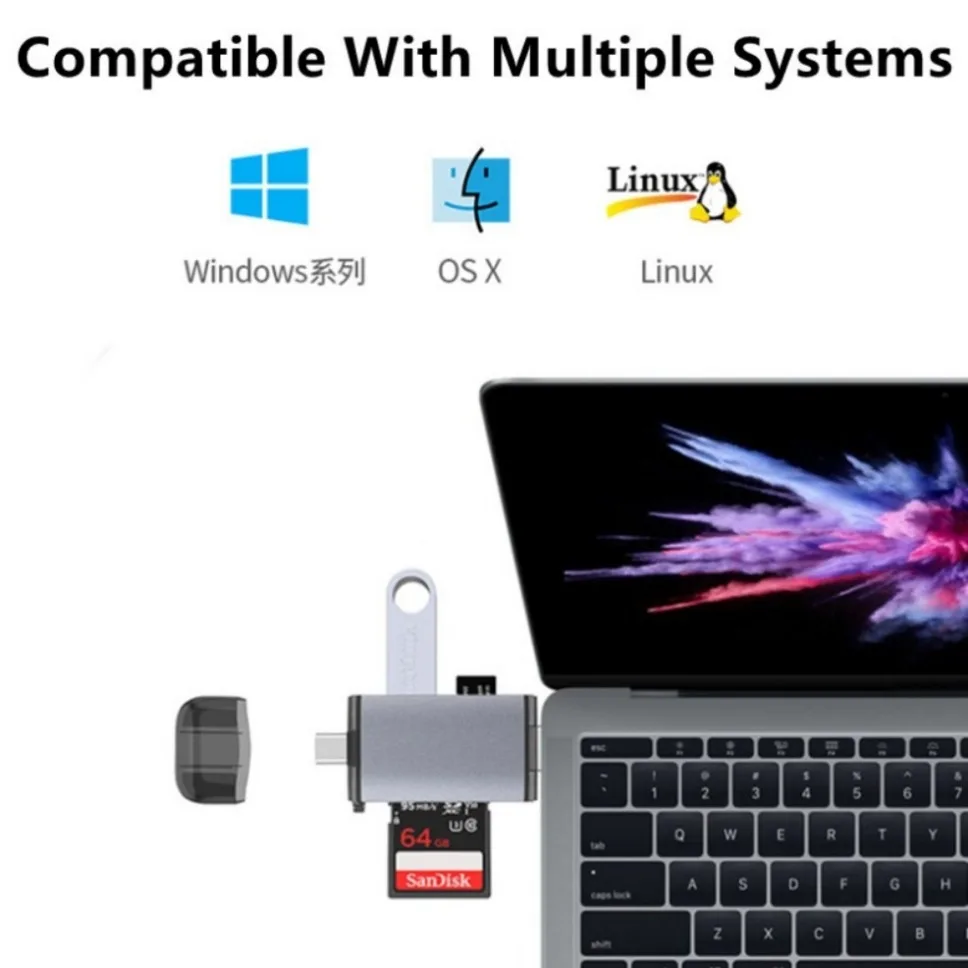 • Este lector de tarjetas es cómodo de usar, utiliza un diseño plug and play, no solo admite acceso a tarjetas SD, tarjetas TF y disco U, sino que también es ampliamente compatible con teléfonos móviles, tabletas, cámaras, computadoras y otros dispositivos, para brindar alta- servicios de transmisión de datos de velocidad.