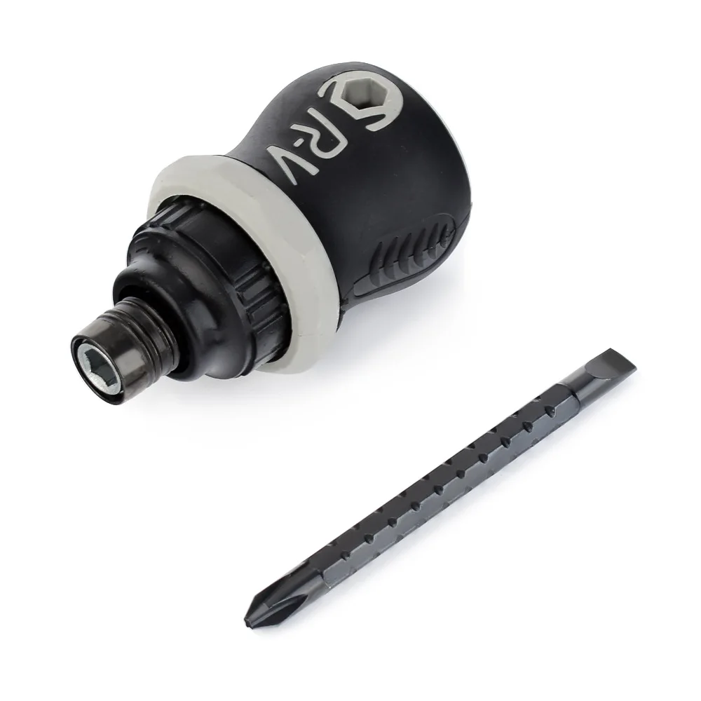 Destornillador de trinquete muy práctico. Las puntas pueden retraerse en el mango para variar la longitud en caso de que el área esté apretada. La variedad de bits también es una ventaja.
