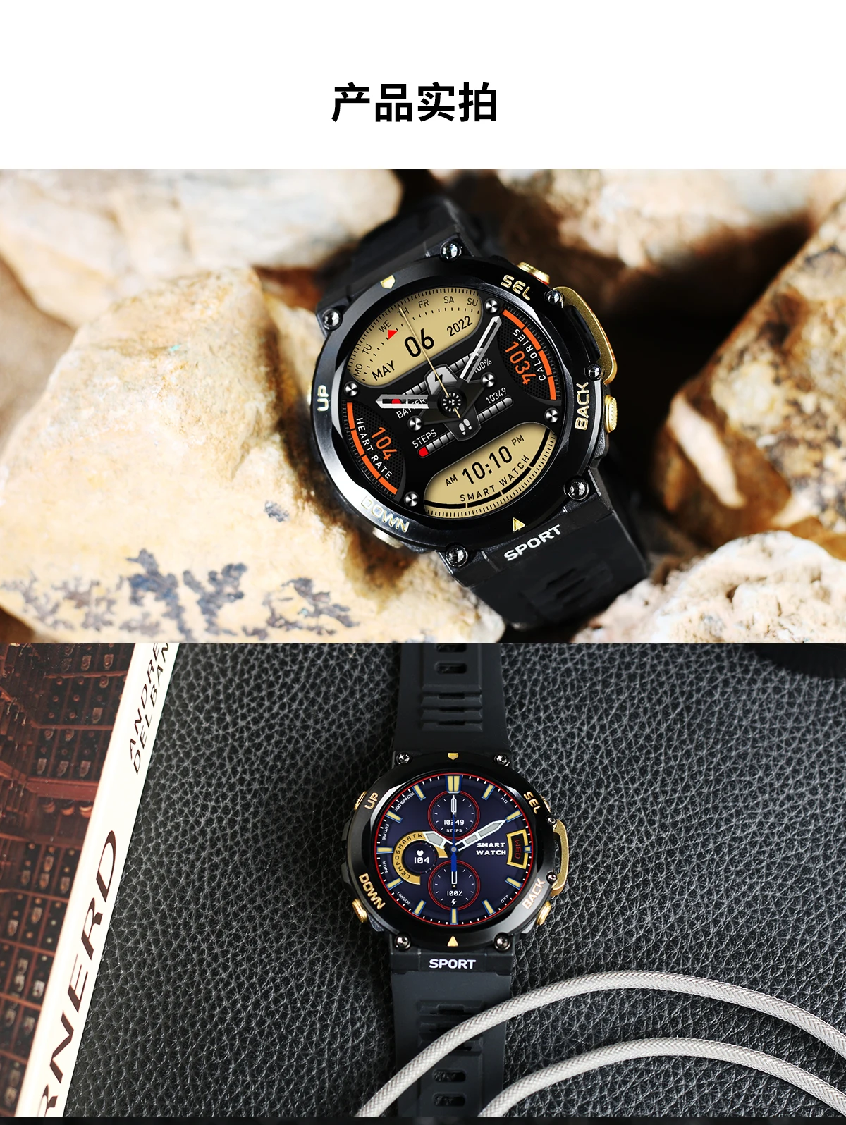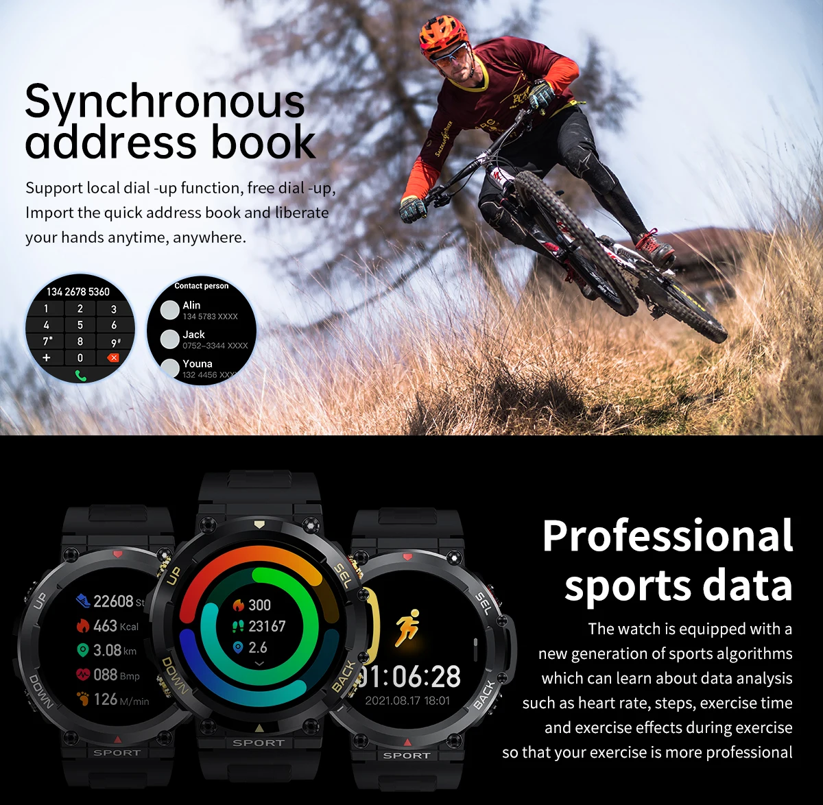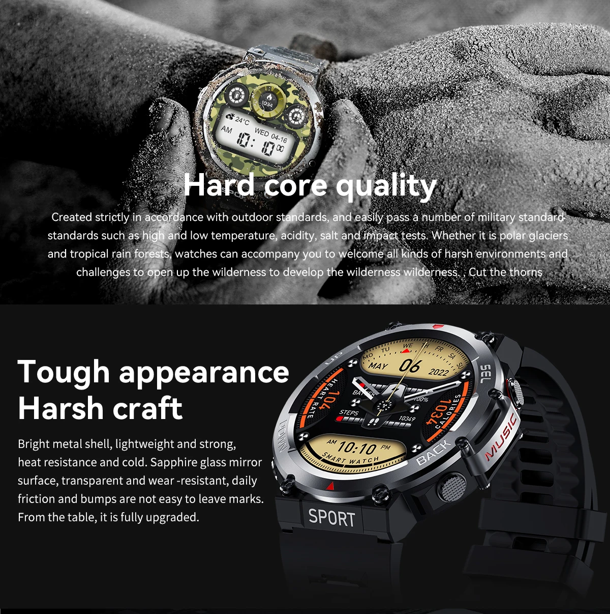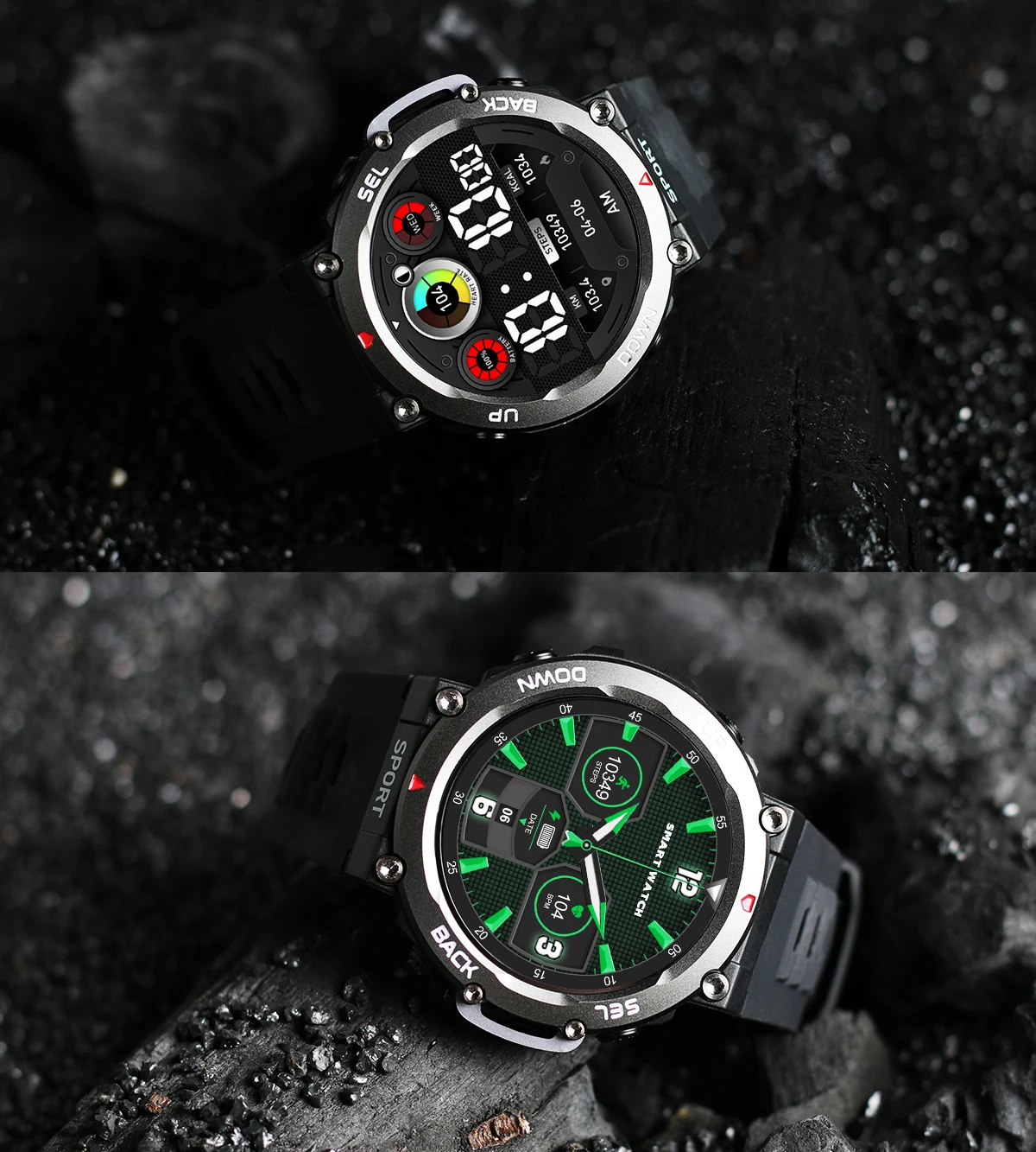 • Caja de acero deportiva: La caja de acero deportiva de este reloj inteligente agrega un toque de elegancia a su estilo al mismo tiempo que brinda durabilidad y protección.