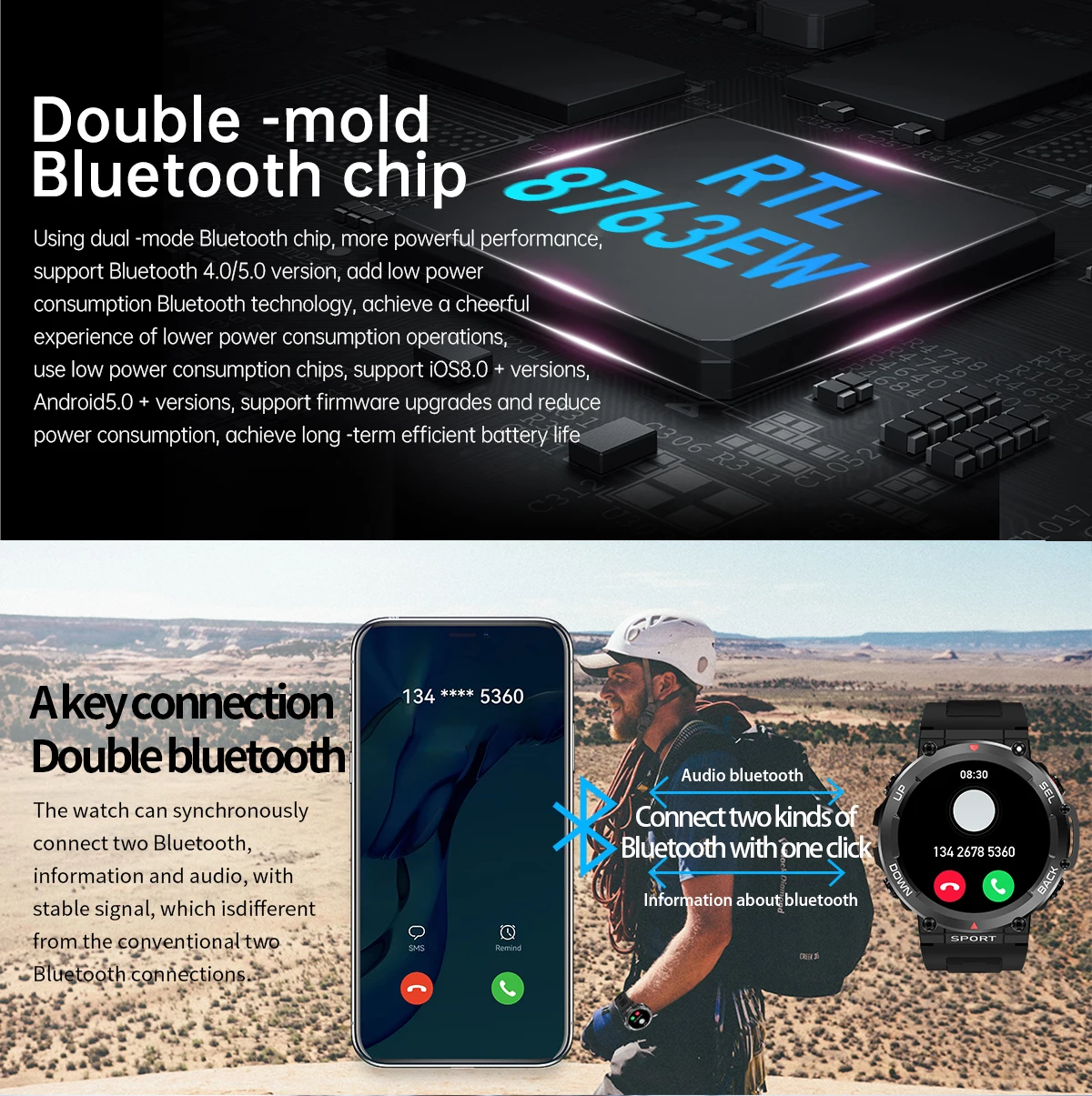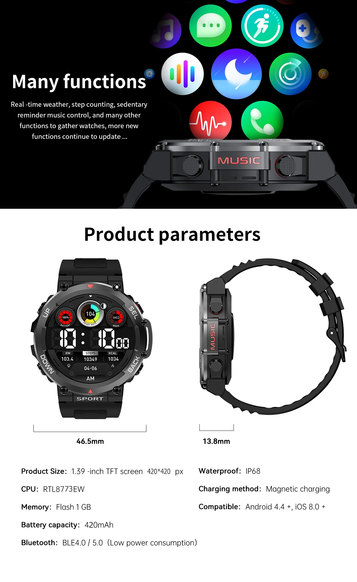 • Pantalla rectangular HD de 1,39". Este reloj inteligente ofrece una resolución: 420*420. Sistema operativo compatible: Android e IOS, sistema Android 4.4 / ios 8.0 y superior
