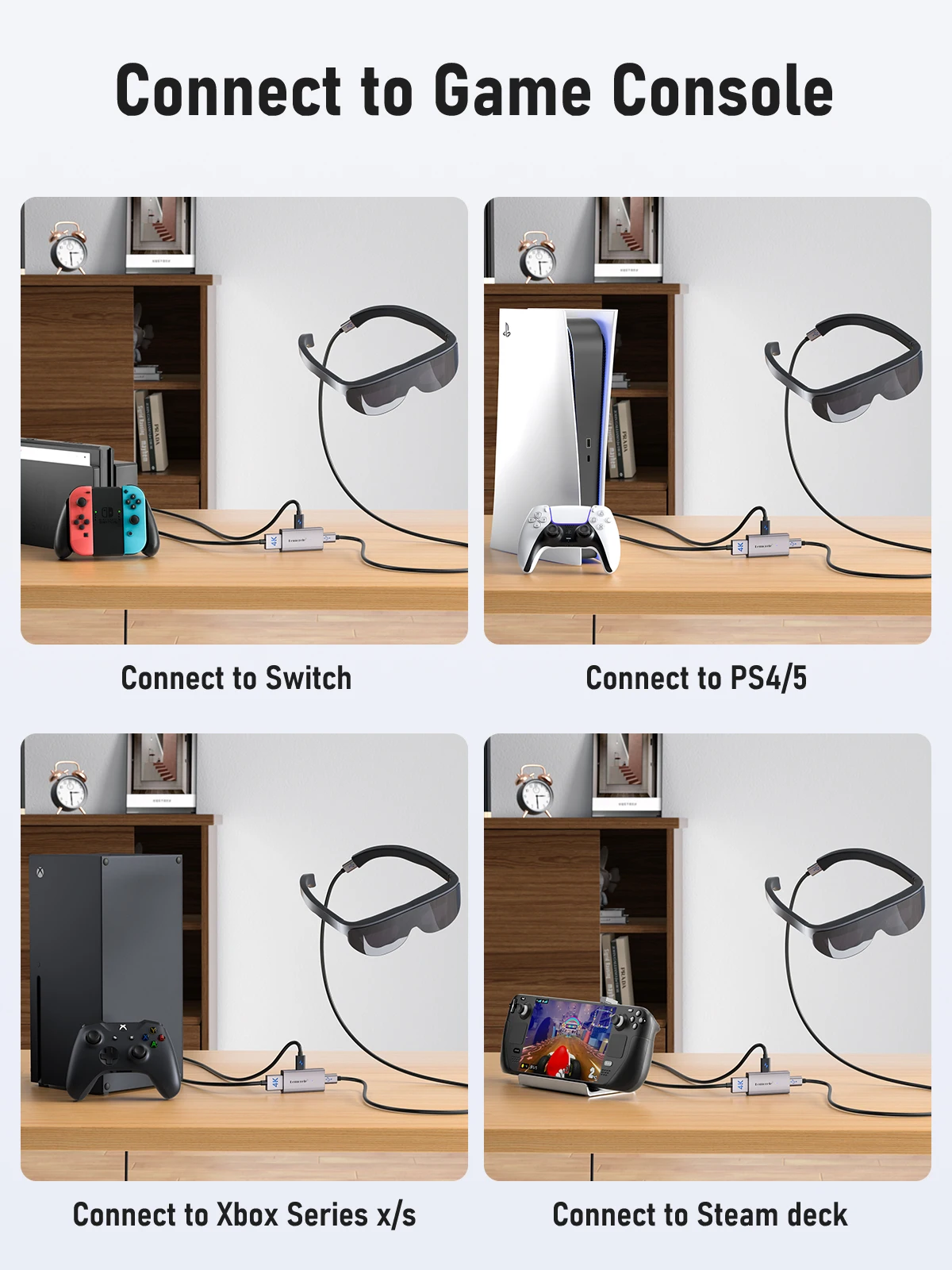 Este adaptador Lemorelle HDMI a USB-C es compatible con Nreal Air, Rokid Air, RayNeo, GRAWOOA y otras gafas AR, y es compatible con muelles de conmutación, PS4, PS5, Xbox, Y otras consolas de juegos convencionales, adecuadas para una variedad de productos portátiles y pantallas con interfaz USB-C.