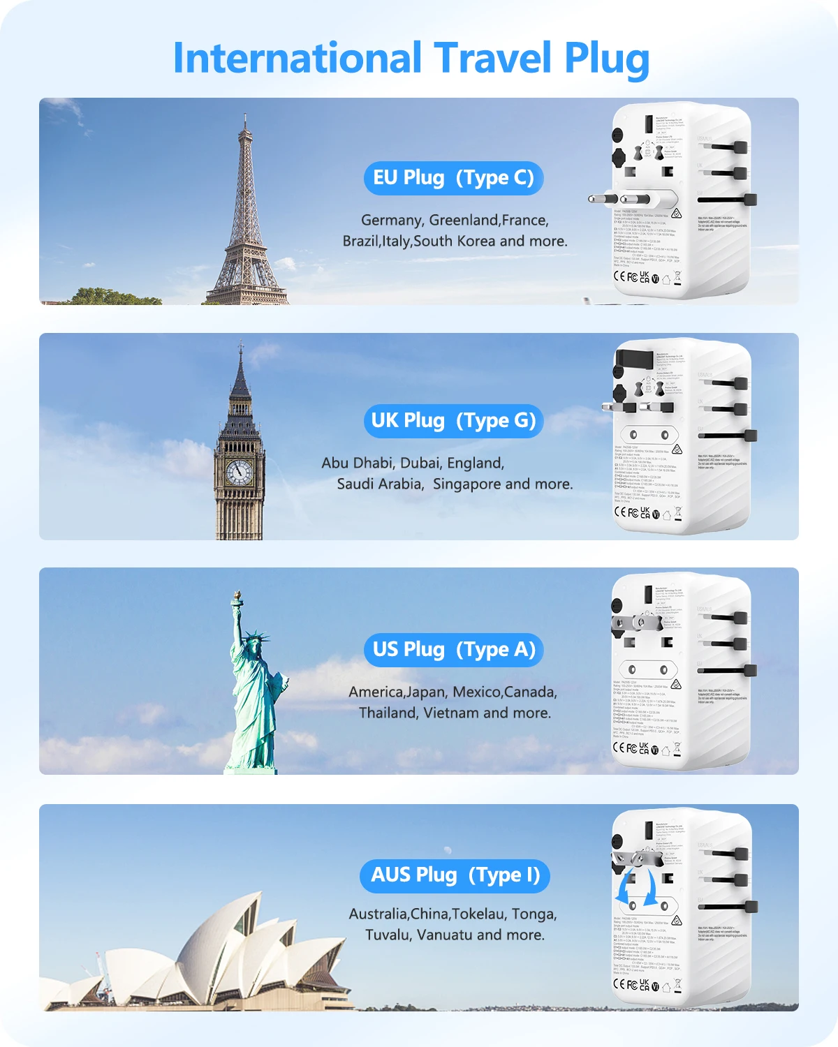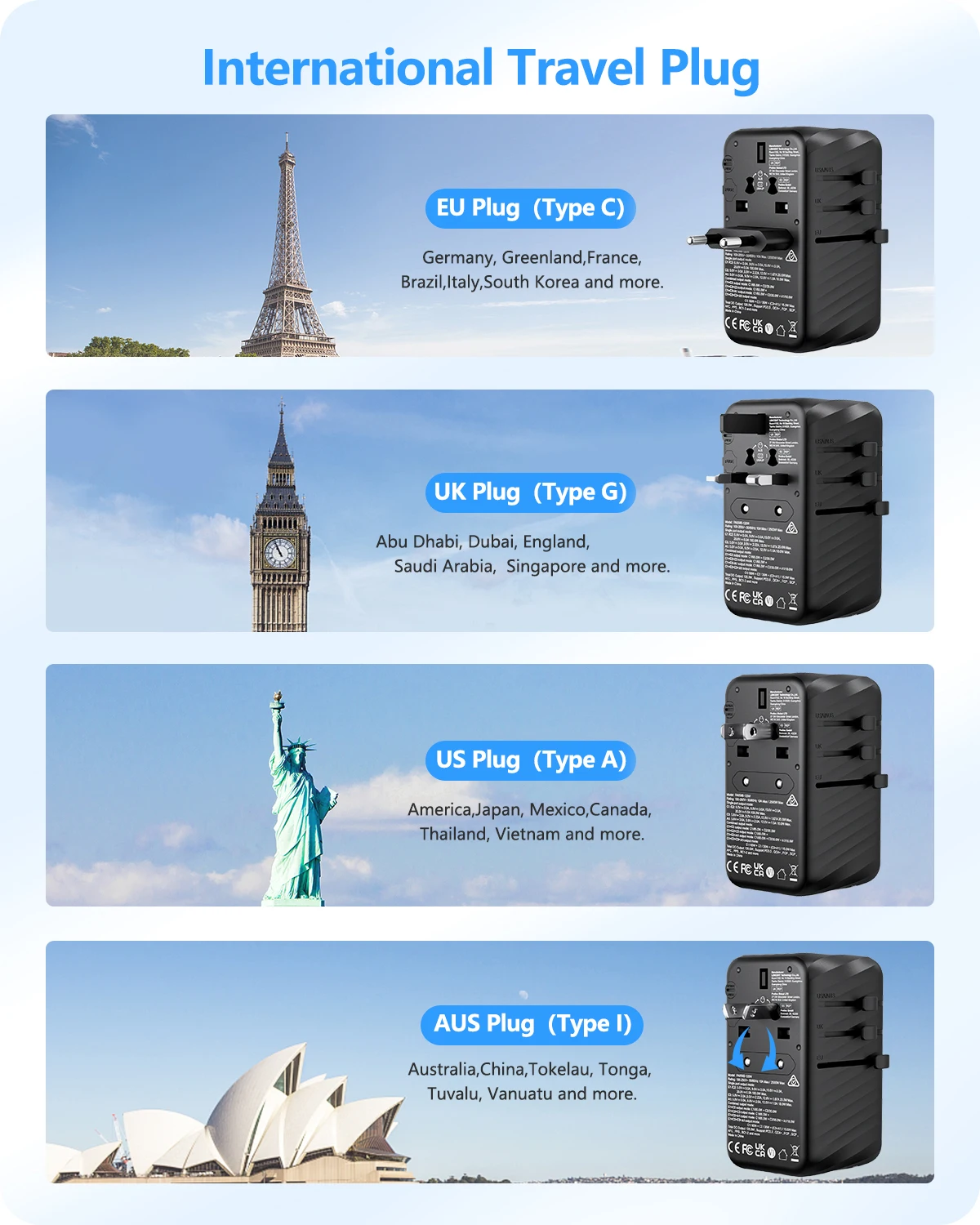 5-in-1 Designed universal plug adaptor can be used over 200 countries, such as Australia, Canada, China, Europe, Japan, UK, USA, and New Zealand. LENCENT's travel adaptor accepts plugs of the following specifications: Type B / Type E / Type F / Type G / Type I .(Not suitable for Denmark, Italy, Israel, India or South Africa.)