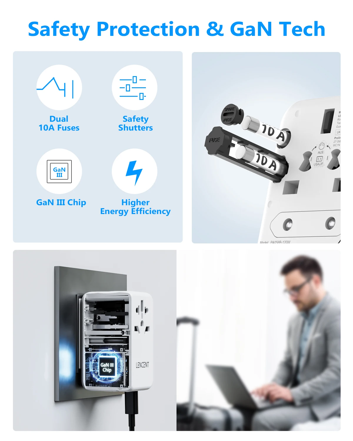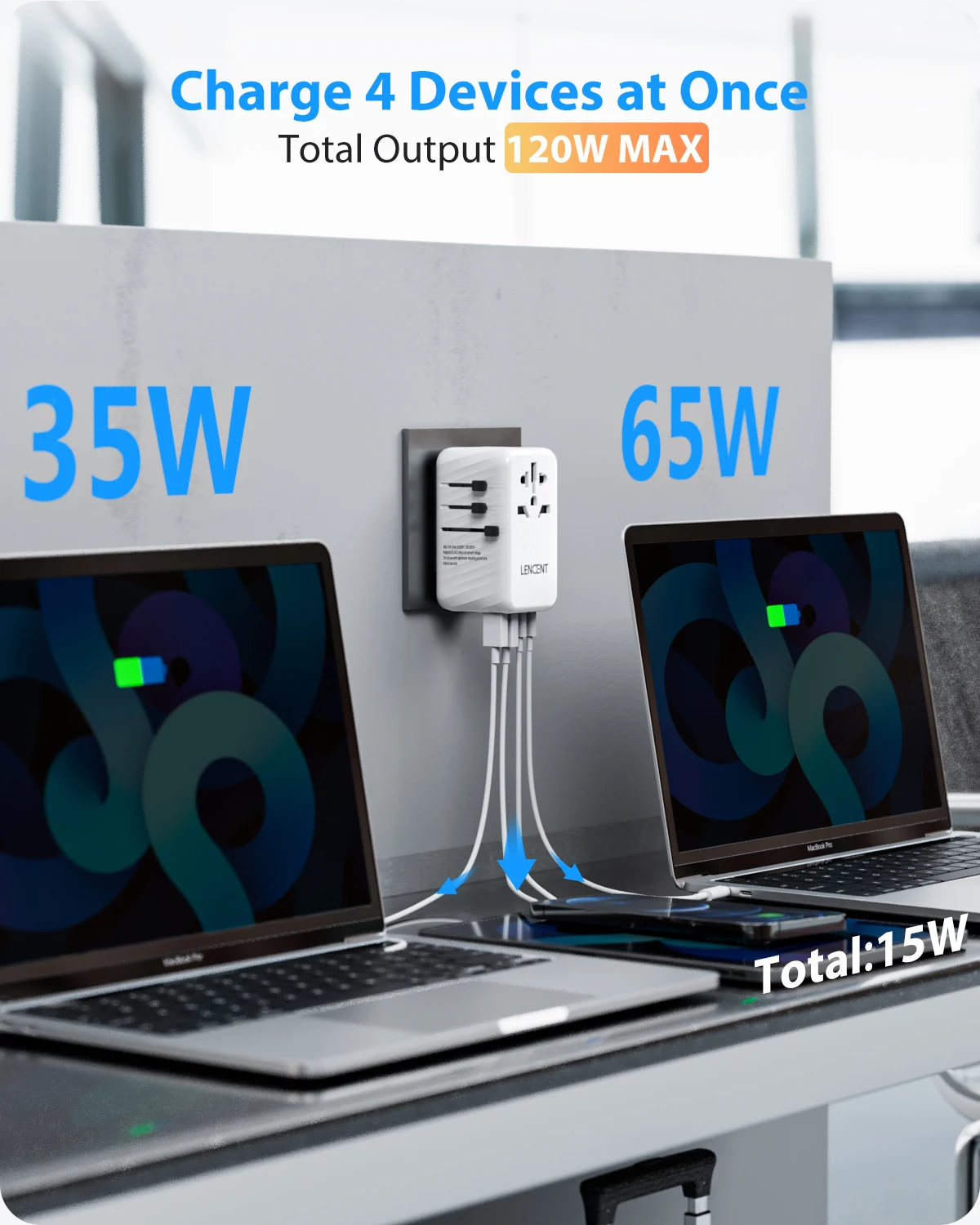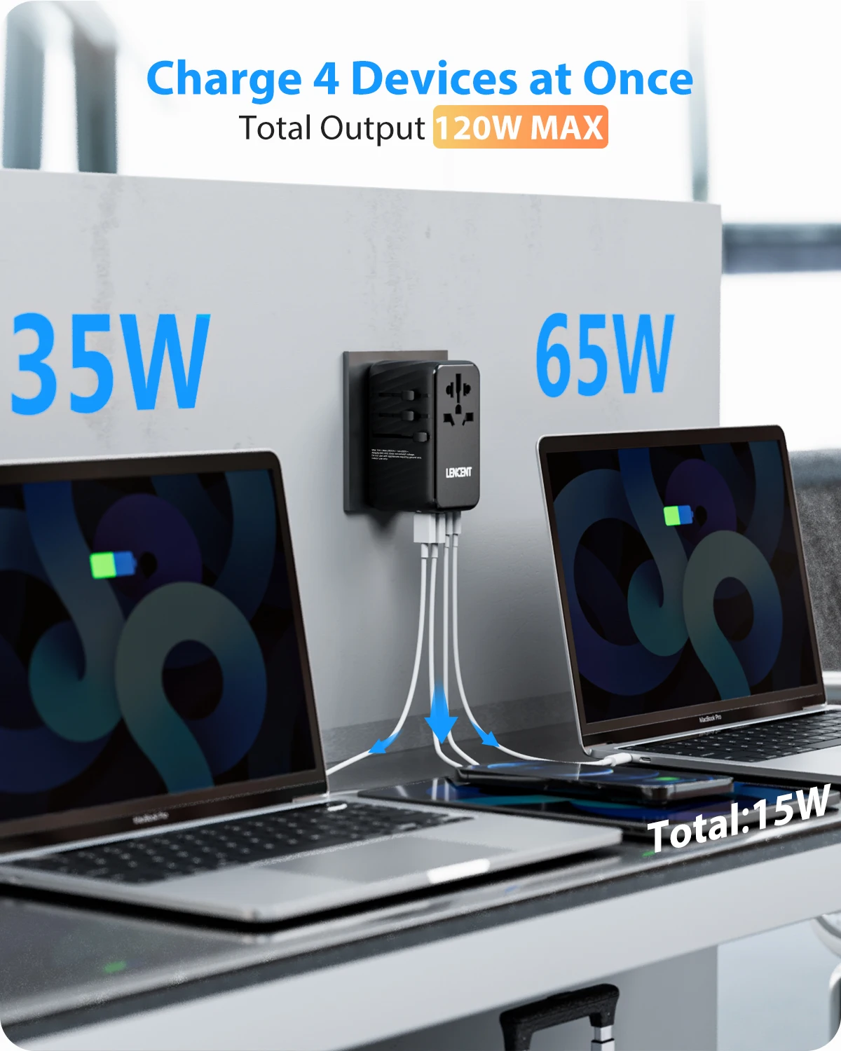 【AUTO-ID Technology for Intelligent Charging】 The LENCENT travel adapter with 2 USB Ports&3Type C Ports is capable of intelligently identifying connected devices and detecting and delivering optimum charging current, ensuring fast and safe charging.