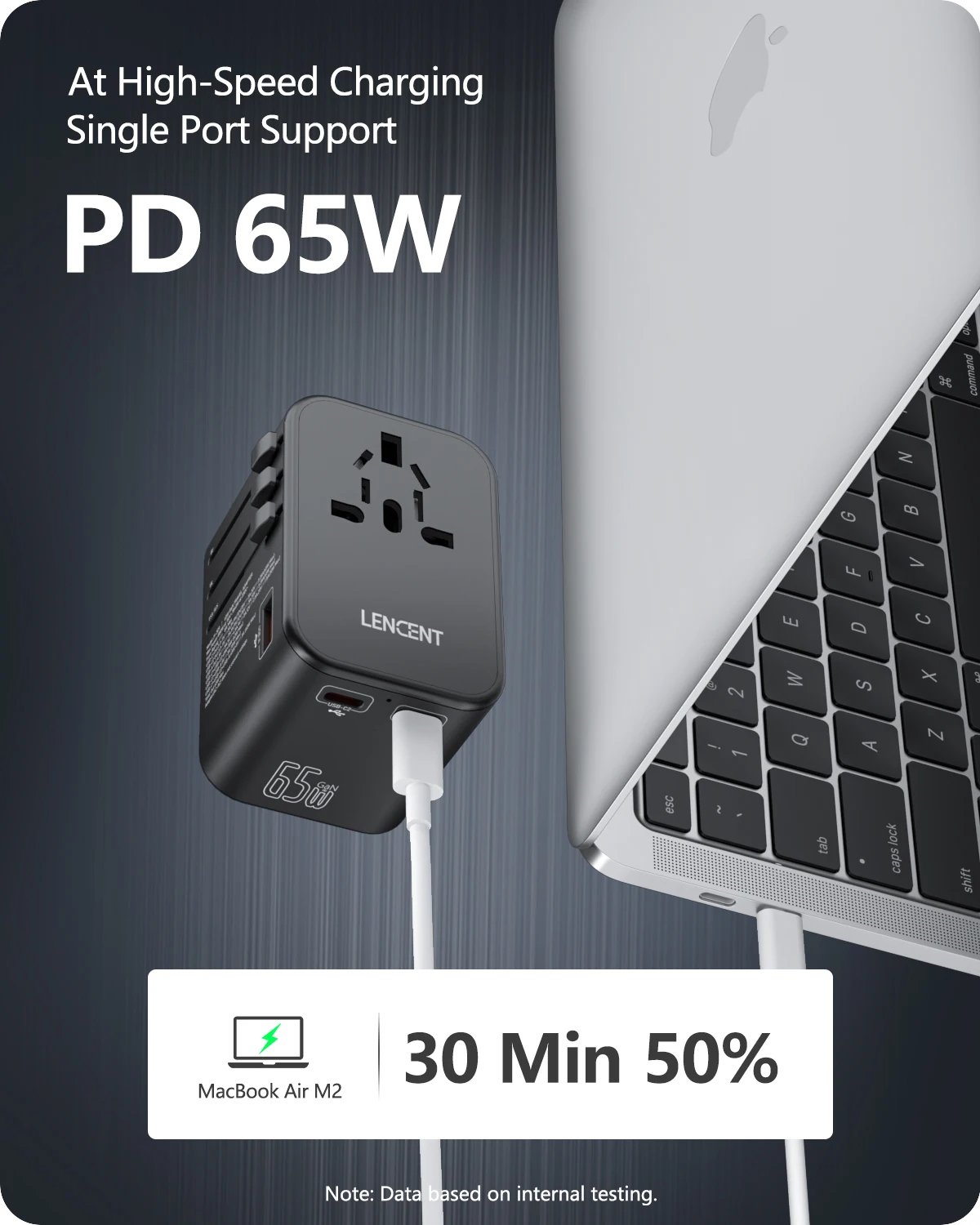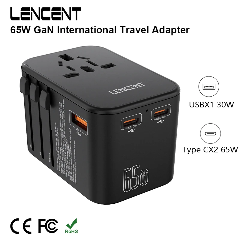 El adaptador de viaje LENCENT con 1 puertos USB (30W Max) y 2 puertos Tipo C (65W Max) es capaz de identificar de forma inteligente los dispositivos conectados y detectar y entregar corriente de carga óptima, garantizar una carga rápida y segura.