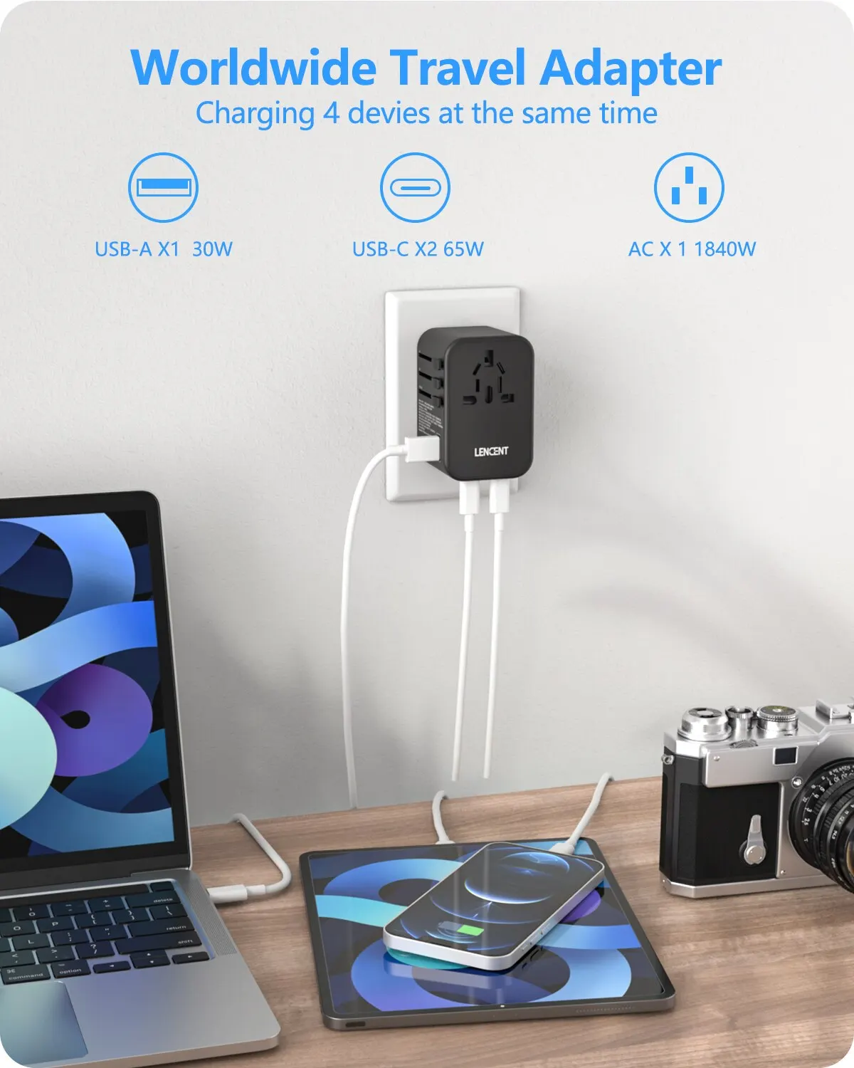El adaptador de viaje LENCENT con 1 puertos USB (30W Max) y 2 puertos Tipo C (65W Max) es capaz de identificar de forma inteligente los dispositivos conectados y detectar y entregar corriente de carga óptima, garantizar una carga rápida y segura.